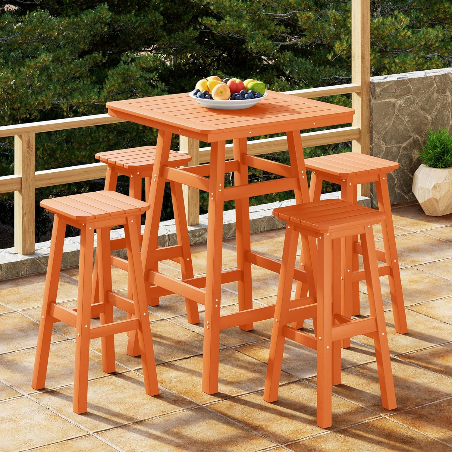 This 5-Piece HDPE Outdoor Patio Dining Bar Bistro Table Set with Bar Stools presents a sophisticated addition to your outdoor patio. Designed for comfort and space with the footrest on the barstools and the 30" wide tabletop. crafted from durable and recycled HDPE material, its design is tailored for outdoor use, boasting UV and weather-resistant properties that safeguard the dining set. available in a palette of fade-resistant solid colors, it ensures the enduring vibrancy of its charming hue each season.
