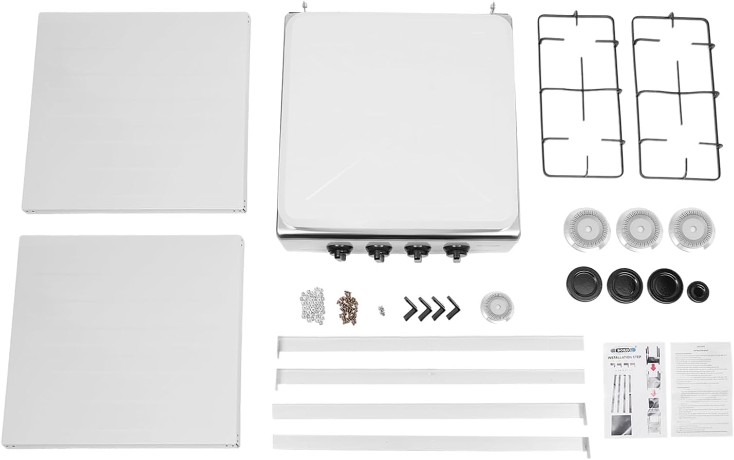 DescriptionThis gas stove is both stylish and practical. Not only does it have a minimalist appearance but it is also made of high-quality material for durability. The 4-burner configuration ensures high cooking efficiency. Each burner is equipped with a control knob for easy operation, and you effortlessly and precisely adjust the firepower. This product will be an ideal cooking choice for your family and outdoor activities.SpecificationMaterial: IronColor: WhiteShape: RectangularProcess: Spray MoldingMount Type: FreestandingAssembly Required: Yes Number of Burners: 4Number of Knobs: 4Fuel Type: NG/LPG (Requires a Low-Pressure Valve to be Self-Provided for Use Together)Power Source: Gas PoweredIgnition Method: Manual IgnitionBottom Height: 6cm/2.36inOverall Product Size: 49*49*79cm/19.3*19.3*31.1inPackage Size: 57*51.5*23cm/22.44*20.27* 9.05inGross Weight: 9.2kg/20.28 lbsNet Weight: 9kg/19.84 lbsDetails Non-slip Bottom: Its four non-slip feet keep the product to remain stable and improve cooking safety.Heat Dissipation Holes: There are evenly distributed heat dissipation holes on the back of the stove, which dissipates heat well, improves the safety of use, and prolongs the service life of the product.Raised Bottom: The 2.36-inch off-the-ground design not only facilitates easy cleaning but also reduces the erosion of ground moisture on the bottom of the product.Smooth Edges: The smooth and burr-free edges not only enhance the beauty of the product but also increase the safety when you are installing and cleaning it. ApplicationIt can be used for stir-fry, noodles, soup, chicken stew, etc. It is suitable for family or outdoor activities such as camping, fishing, RV travel, emergency preparedness, and so on.Package Included1* Natural Gas Stove with 4 Burners1* English Manual