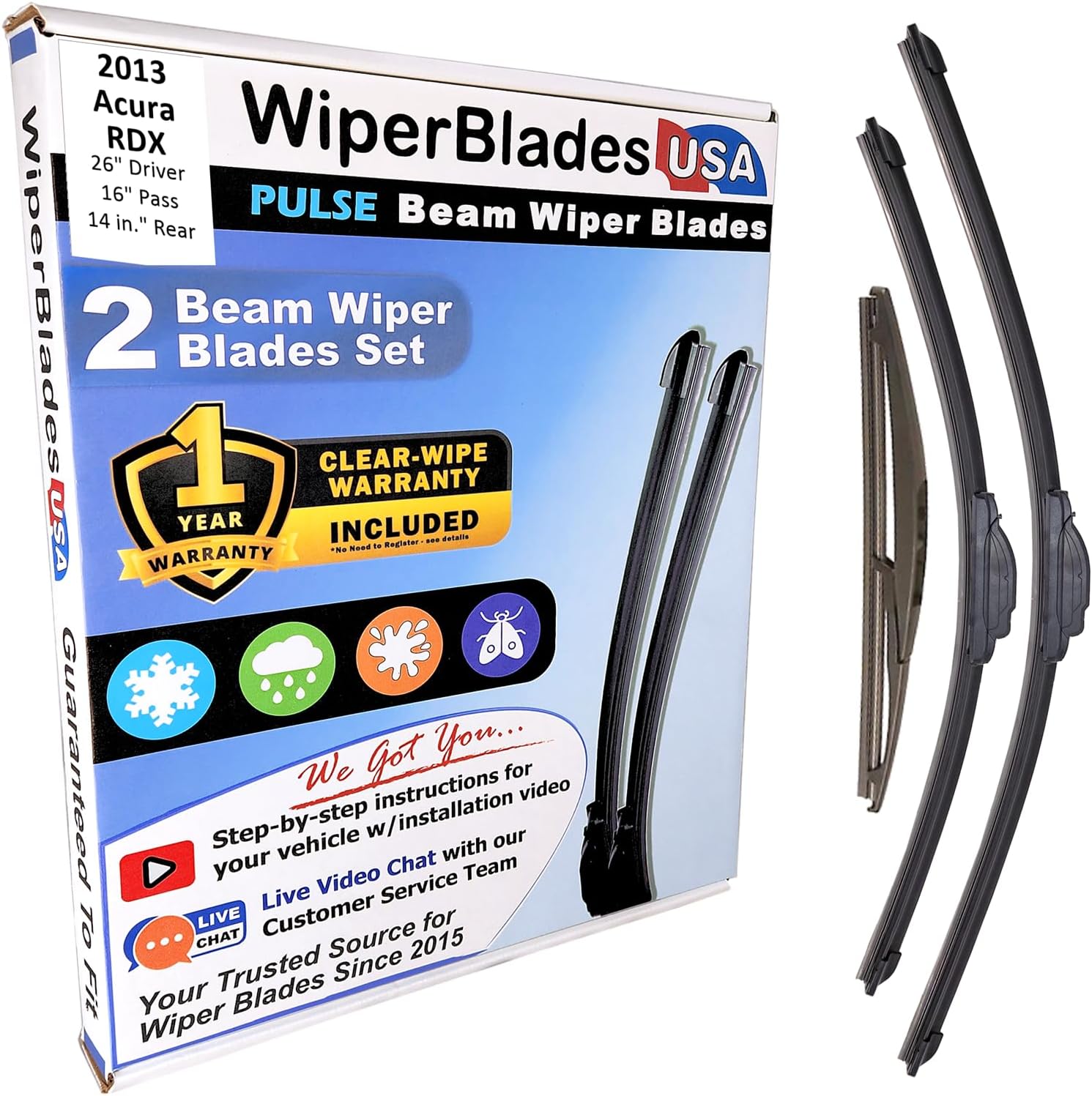 Pulse Beam wiper blades wipers set +Trico ExactFit Rear wiper compatible with Acura MDX 2020WiperBladesUSA Beam Wiper Blades - Durable Flexible Beam Blade These WiperBladesUSA® beam wiper blades contour to the curvature of your windshield to provide even wiping pressure along the full length of the blade. These wiper blades have a 1 year Wiper Wear Warranty included. Meaning if they stop keeping you safe you get a credit towards a fresh pair. (See Details) When WiperBladesUSA says "We Got You" we want to make sure you keep good working wipers on your car. Every day. All the time. These beam wiper blades are designed to be compatible with Acura MDX 2020 Virtually streak-free visibility Great wipers to have in rain, sleet and snow1 year "Clear-Wipe Warranty"Smooth, chatter-free wipe is a result of the specially blended teflon rubber bladeEnhanced flexibility and grip from the durable, rubber-encased substructureSignificant noise reduction and wind lift through a built-in aerodynamic spoiler to keep the wiper on the windshield at freeway speedsAll weather tough wiper blades with a synthetic rubber squeegee that will withstand even the most extreme weather conditionsPrevents ice and snow build-up through the elimination of exposed metal components. Easy Installation: Included in the bundle are directions (w/video) to simple and easy to use step-by-step installation on to your vehicle