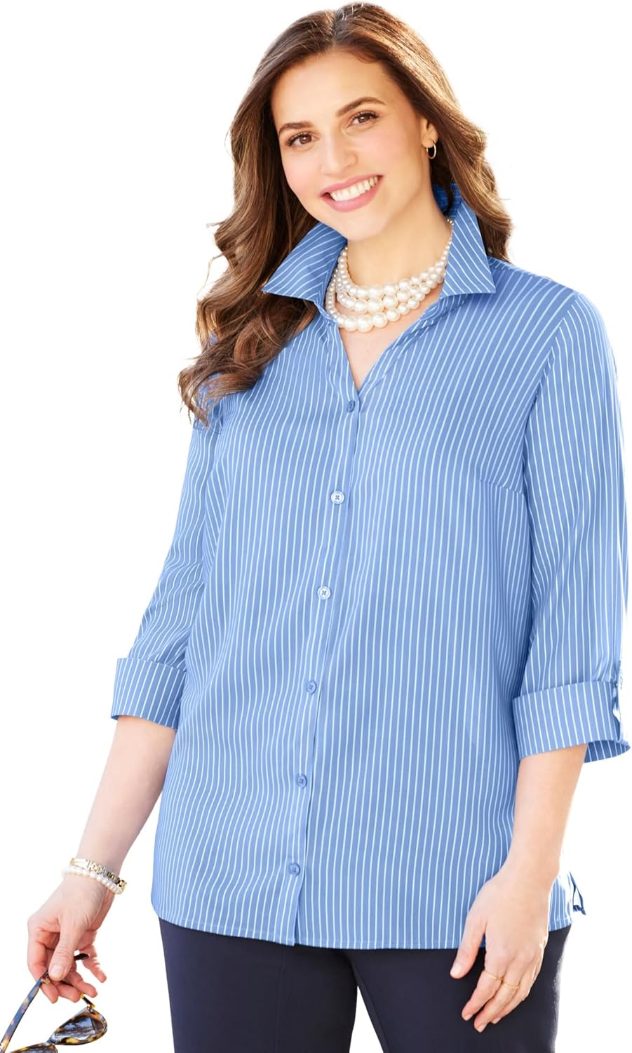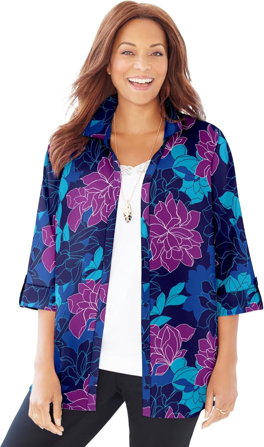 Smooth Crepe de Chine fabric floats over your curves for a fit that feels almost life-changing. This classic button front with notch neckline and cuffed sleeves is so smooth and comfortable, you’ll want way more than one. FABRIC: Wrinkle-resistant. Smooth opaque Crepe de Chine fabric is lightweight, comfortable, and cool-to-the-touch. Floats away from the body without clinging. FIT: Relaxed and easy. Shirt collar with notch neckline. Full button front. 3/4 sleeves with button closure. Bust darts provide shape and the perfect fit. Side slits. 97% Polyester/3% Spandexbr>Machine washbr>Importedbr>Regular: 31” lengthbr>Petite Short: 28” lengthbr>Petite: 29” lengthbr>Plus Sizes 0X–6X, Petite Short Plus Sizes 0XWPS–3XWPS, Petite Plus Sizes 0XWP–3XWPbr>Catherines