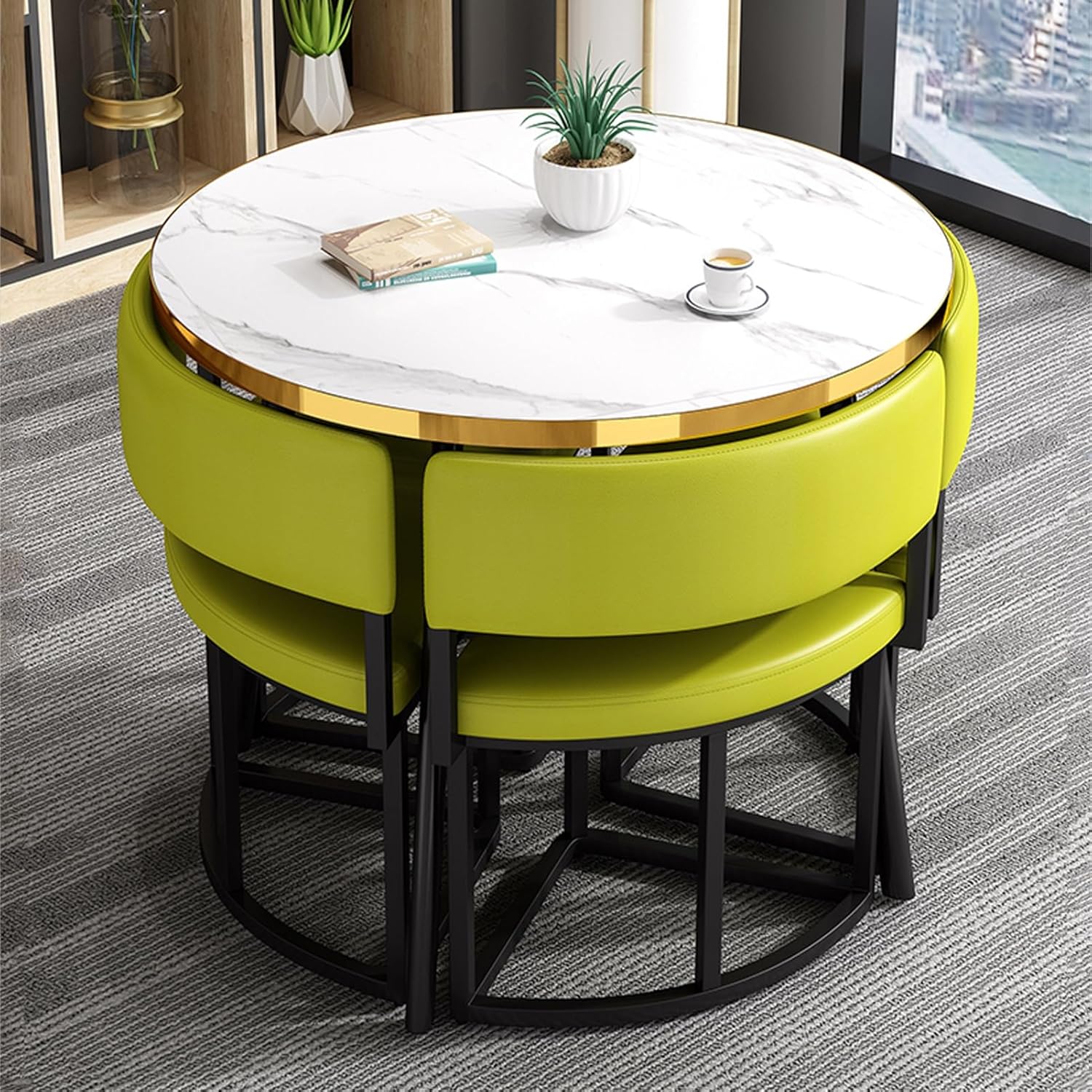 Product DescriptionThis table and chair set can not only be used as a conversation coffee table in the office reception room, but also can be used as a small dining table in the kitchen or a small conference table in the office. Metal painted chair frame, thickened tripod, stable and not shakingFeatures: simple and elegant, saving spaceOutrigger color: blackStyle: simple and modernBracket structure material: metalMesa shape: roundDesktop material: imitation marble,E1 grade high density wood board materialTable top diameter: 80 cm/31.5 inchesChair material:rebound sponge, PU leatherTotal chair height: 35.4in/90cm✲Applicable number of people: 4 people✲Packing method: Assembled✲Packing list: 1*table, 4*chairs▲ Note:1. The product size is similar, there is a 1-2cm error, the actual size shall prevail2. Due to light, angle, monitor and other reasons, there may be a certain color difference. All products are subject to the actual product.