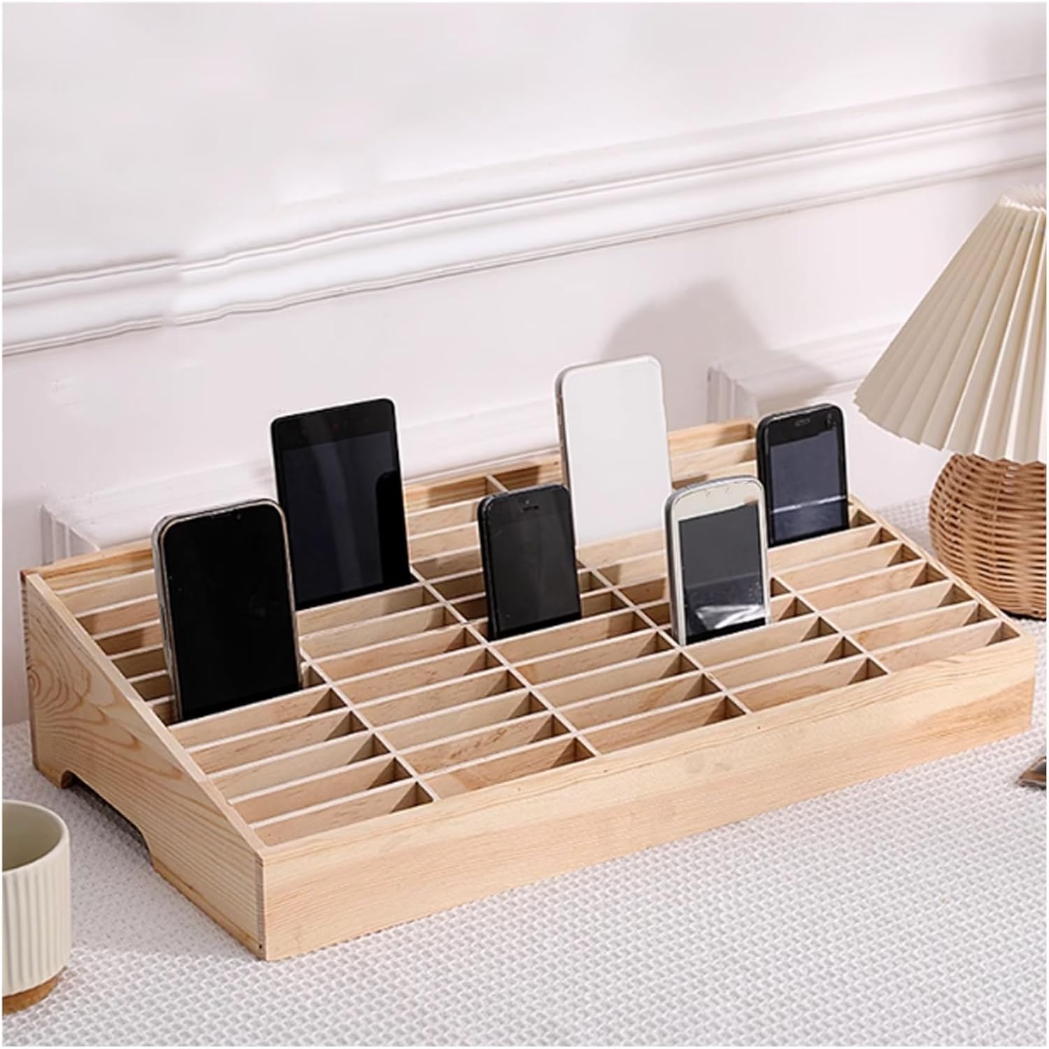 Freestanding Metal Phone Safe Deposit Organizer Box:Are you concerned about losing your cell phone while at the gym? Do you find it difficult to keep students focused during class due to phone distractions? Or are you looking for a reliable way to store and organize your phone during seminars or exams? Our cell phone lockers offer a practical solution to these common challenges. Designed for efficiency and security, our wooden cell phone lockers allow you to centralize and manage your devices, enhancing both your daily life and study productivity. Available in various sizes, these lockers cater to different needs, ensuring you can find the perfect fit for any environment. **Specifications:** - **Material:** Durable Wood - **Color:** Light - **Assembly:** No assembly required **Available Sizes:** - **6 Layers:** Capacity of 12 phones (21 cm x 15 cm x 9 cm) - **8 Layers:** Capacity of 24 phones (30 cm x 19 cm x 10 cm) - **12 Layers:** Options for 36 (30 cm x 27.5 cm x 11.5 cm), 48 (40.5 cm x 27.5 cm x 11.5 cm), or 60 (51 cm x 28.5 cm x 11.5 cm) phones **Features:** 1. Crafted from high-quality wood, our lockers require no assembly and are ready to use. 2. The transparent design allows easy visibility of stored items, minimizing the risk of loss. 3. Layered design ensures straightforward organization and quick access to your device. 4. Compatible with various smartphone models, making it a versatile choice for any user. 5. Helps maintain focus in classrooms by preventing distractions from mobile devices. 6. Designed with a curved handrest for effortless mobility and transport. **Package Includes:** - 1 x Cell Phone Storage Locker **Notes:** - Minor size discrepancies (1-3 cm) may occur due to manual measurements and different production batches. - Color variations may appear between the recording and display; please refer to the actual product for accuracy. Invest in our cell phone lockers today and enjoy a more organized, distraction-free en