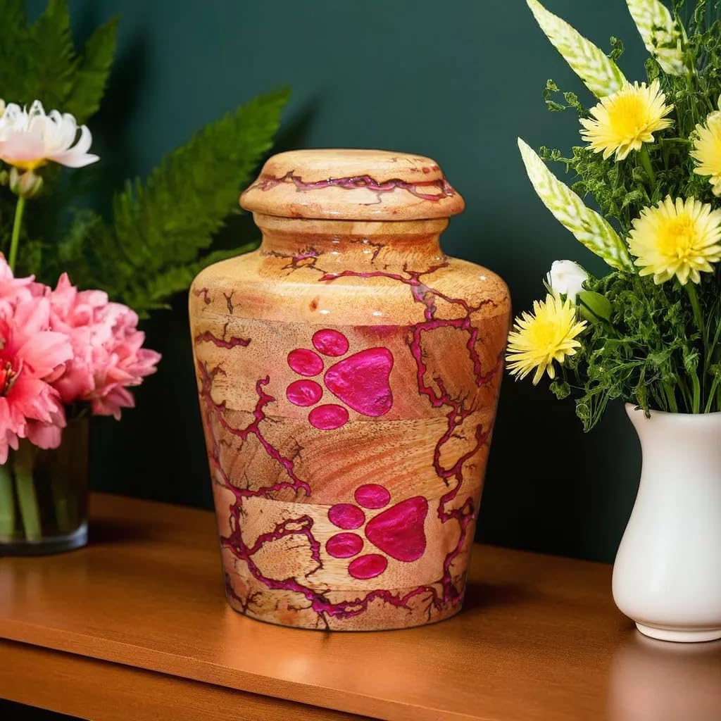 Dimensions & Their Capacity:- X Small : 3 inches Diameter 4 Inches Height and Capacity: 20 cubic Inches suitable for 20lbs weight Small: 4 inches Diameter 6 Inches Height and Capacity: 100 cubic Inches suitable for 100lbs weight Medium: 6 inches Diameter 7 Inches Height and Capacity: 110 cubic Inches suitable for 110lbs weight Large: 7 inches Diameter 9 Inches Height and Capacity: 130 cubic Inches suitable for 130lbs weight Simple and elegant wooden urn with a paw print design. The Significance of Wooden Urns for Ashes Wooden urns have been used for centuries to memorialize loved ones who have passed away. Wood's natural beauty and warmth make it a popular choice for those seeking a dignified and respectful way to honor their loved one's memory. Benefits of Wooden Pet Urns Using wooden pet urns instead of traditional plastic containers has several benefits for both the environment and your beloved pet. Sustainability: Wooden pet urns are made from renewable resources and can be recycled or biodegraded after use. Durability: Wood is a sturdy and long-lasting material that can protect your pet's remains for years to come. Fractal Burning: A Personal Touch Fractal Burning is a unique technique that involves burning intricate designs into the wood's surface. This technique creates a beautiful and personalized tribute to your loved one's memory. Fractal Burning Fractal burning, also known as Lichtenberg burning, is a technique that uses high-voltage electricity to create unique patterns in wood. The process involves applying a conductive solution to the wood and running an electrical current through it, creating a pattern of branching lines resembling lightning strikes. This technique can be used to create one-of-a-kind designs on wooden urns for adult cremation ashes.