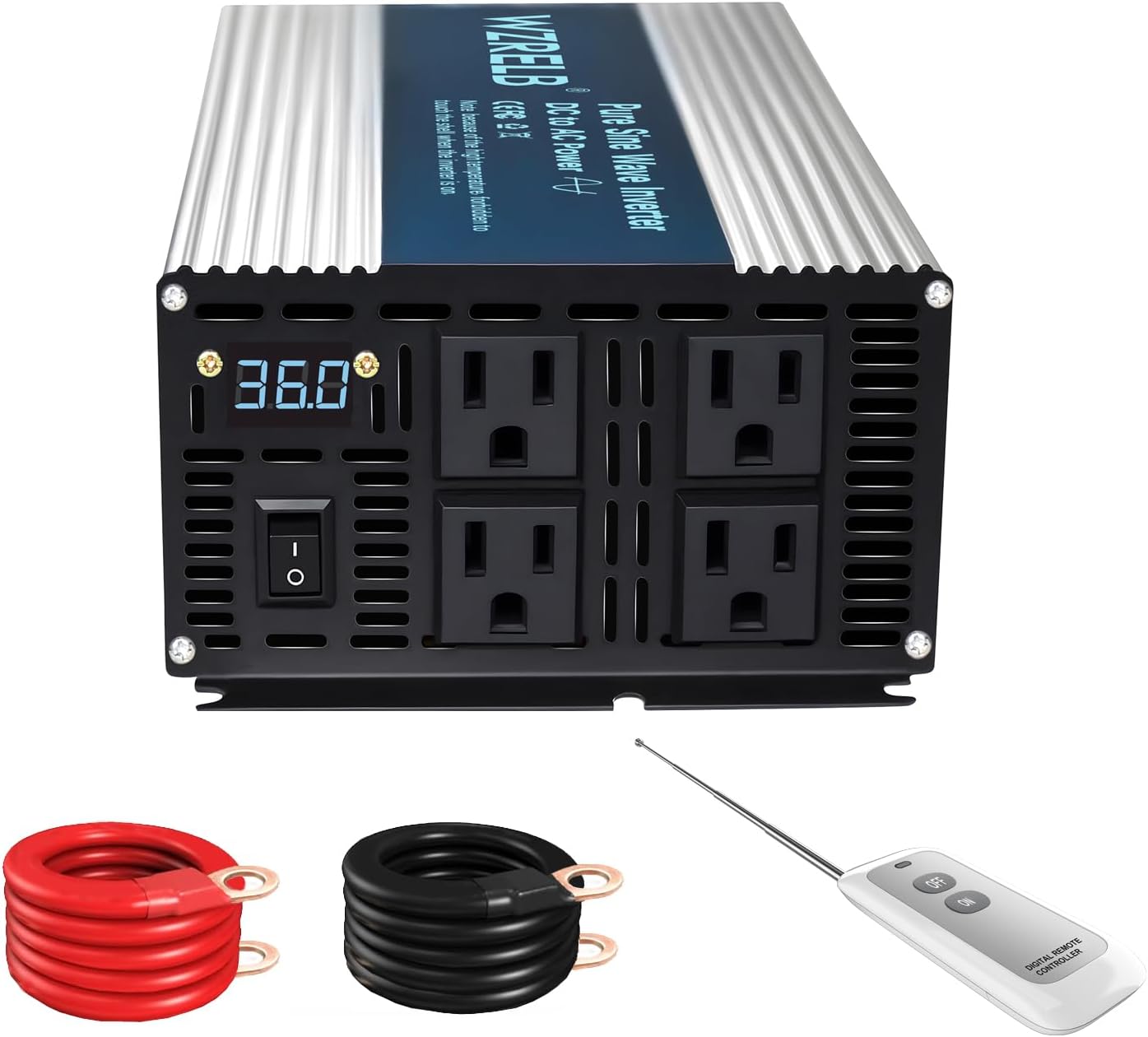WZRELB 2000W Pure Sine Wave Inverter 12V DC to 110V 120V AC Power Converter with LED Display, Remote Controller, Off-Grid Power Inverter 4000W Surge with 4 AC Outlets,for Home, RV, Truck, Camping