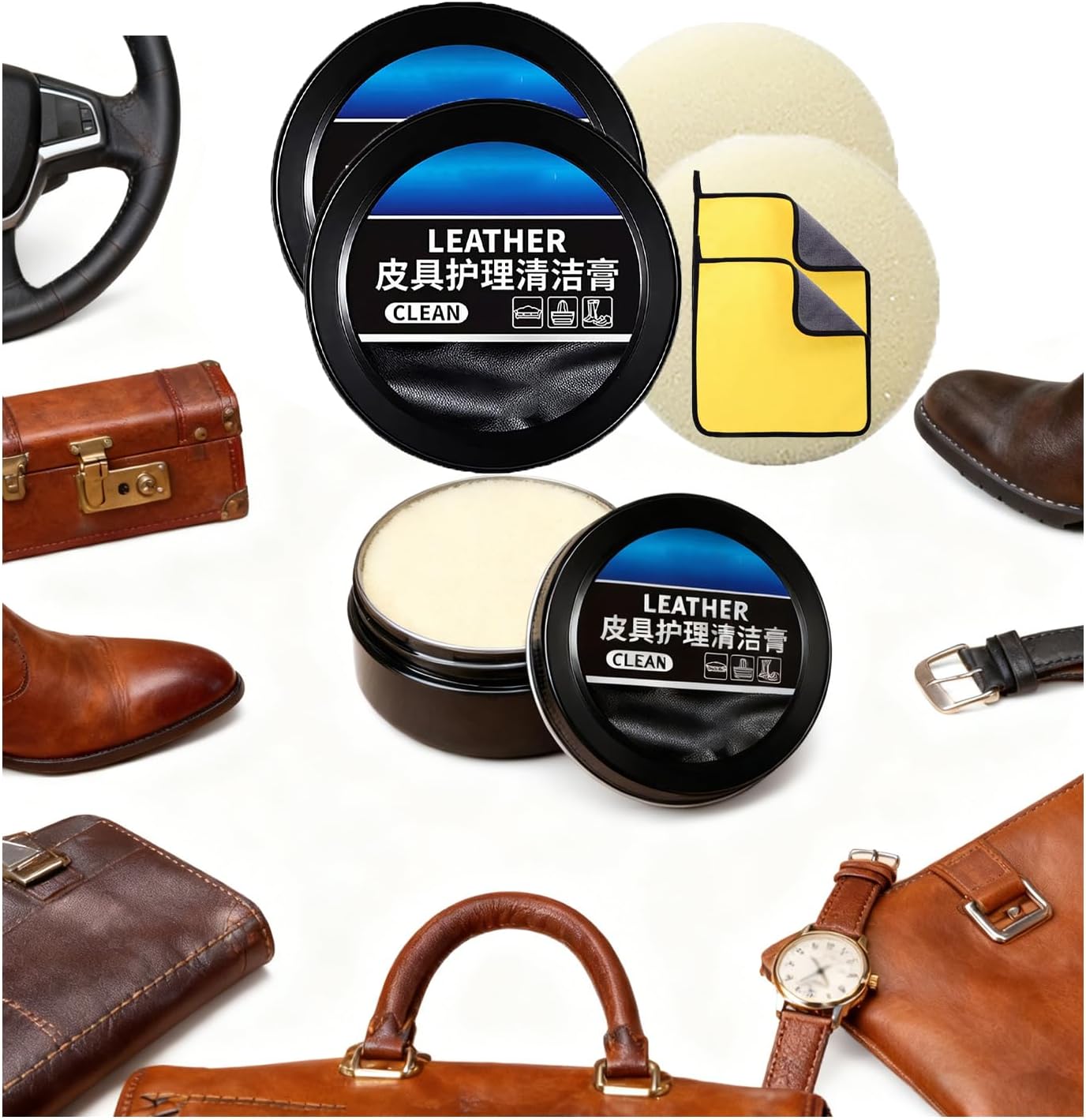 Condition & protect in one simple step to maintain any leather surface Specification: Product Name: Leather Cleaning and Care Cream & Cleaning Paste Net Weight: 160g Key Features: Dual-Action Formula: Cleans and conditions in one easy application Deep Penetrating Care: Restores natural oils and flexibility to leather Protection: Helps prevent cracking, fading, and premature aging Safe for All Leather Types: Compatible with genuine leather, synthetic leather, and vinyl Easy Application: Smooth paste consistency for effortless spreading Benefits: Removes dirt, grime, and stains from leather surfaces Restores natural shine and softness Prevents cracking and drying Extends the life of leather upholstery Leaves a pleasant, subtle fragrance Suitable For: Car seats and interior panels Leather steering wheels Dashboard leather trim Motorcycle seats Furniture and accessories Leather bag Leather jacket How to Use: 1. Clean surface of loose dirt and debris 2. Apply small amount of cream to clean cloth 3. Work into leather using circular motions 4. Allow to penetrate for 5-10 minutes 5. Buff with clean, dry cloth for best results Key Features: Dual-Action Formula: Cleans and conditions in one easy application Deep Penetrating Care: Restores natural oils and flexibility to leather Protection: Helps prevent cracking, fading, and premature aging Safe for All Leather Types: Compatible with genuine leather, synthetic leather, and vinyl Easy Application: Smooth paste consistency for effortless spreading Benefits: Removes dirt, grime, and stains from leather surfaces Restores natural shine and softness Prevents cracking and drying Extends the life of leather upholstery Leaves a pleasant, subtle fragrance Suitable For: Car seats and interior panels Leather steering wheels Dashboard leather trim Motorcycle seats Furniture and accessories Leather bag Leather jacket How to Use: 1. Clean surface of loose dirt and debris 2. Apply small amount of cream to clean cloth 3. Work into leather using circular motions 4. Allow to penetrate for 5-10 minutes 5. Buff with clean, dry cloth for best results Package Includes: 1/2/3 Pcs * Cleaning and Care Cream & Cleaning Paste + 1/2/3 Pcs * Sponges + 1/2/3 Pcs * Towels Note: 1. Please allow slight differences due to manual measurement. 2. Due to the different monitors and light, the picture may not show the actual color of the item. Thank you for your understanding.