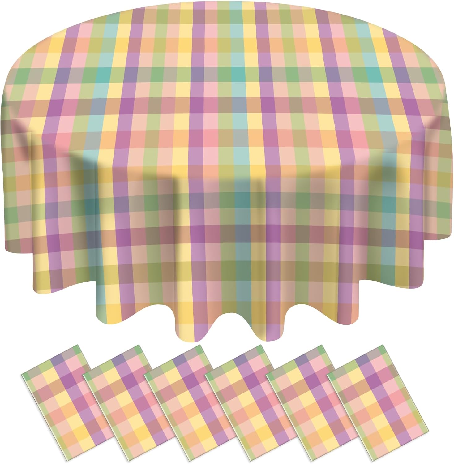 12Pcs Spring Easter Buffalo Plaid Checkered Round Tablecloth Decorations, Plastic Watercolor Pink Blue Yellow Pastel Dinner Table Cover for Indoor Outdoor Spring Birthday Easter Party Supplies,84 Inch