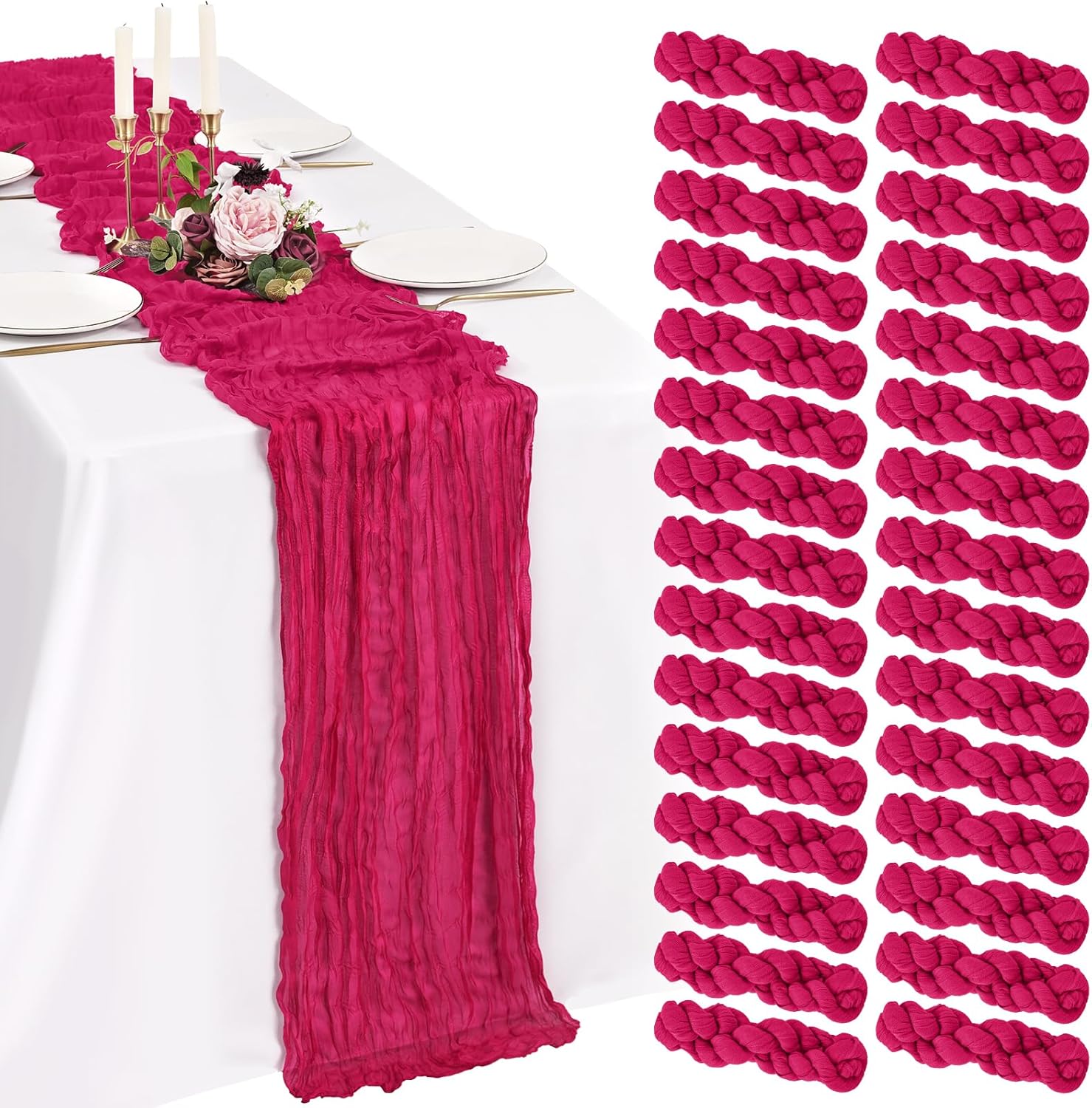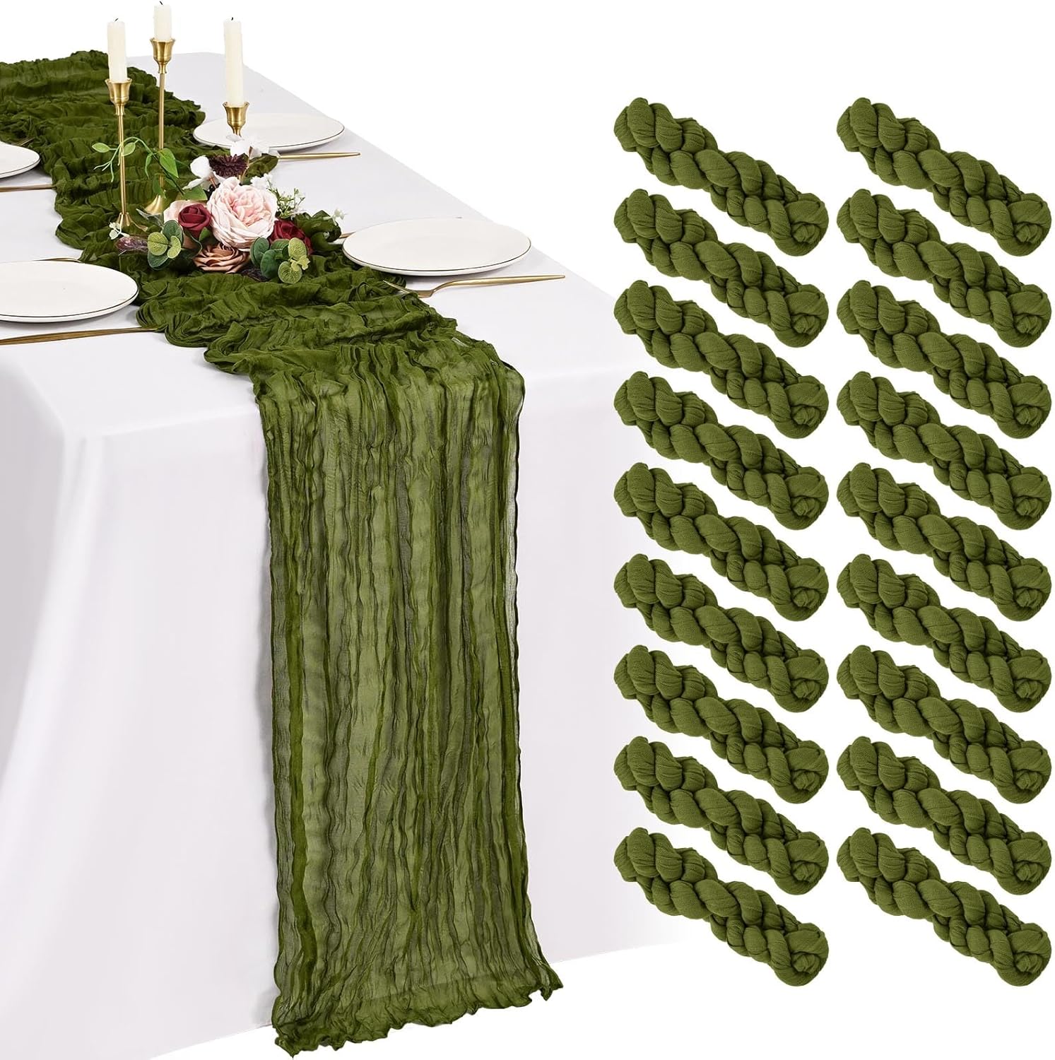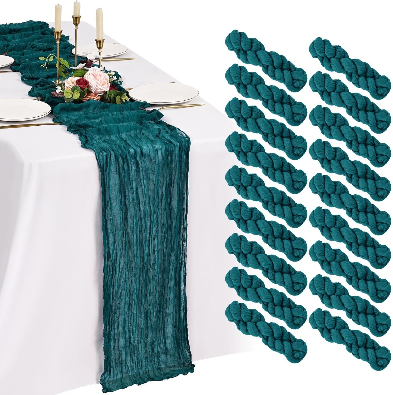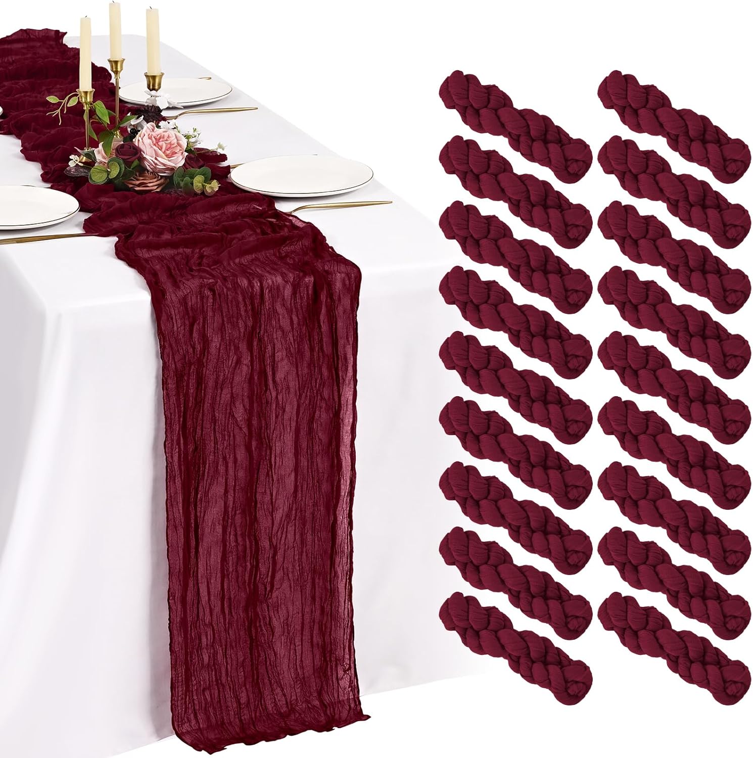 Every Piece Matters to ShowgeousEach set includes 18 pack cheese cloth table runners, measuring 21 x 120 inches (in flat condition), providing ample coverage for your dining table.This ideal size works perfectly for most rectangular and round tables, and can also be used to decorate fireplaces, chairs, curtains as well as wedding arches.FeaturesSoft and ReusableVintage and RomanticSheer and ElegantHandmade and QualityWell-stitched edgesPremium MaterialBeige cheesecloth gauze table runners are made of premium sheer cheese cloth gauze fabric, soft and smooth, hand-dyed from natural material. Washable – colors won't fade with repeated washing. Durable – edges are well-stitched to prevent fraying with repeated use.The rustic boho style with delicate edges and stitches will make your events more romantic and elegant.Exquisite Wrinkled TexturePleating craft, bringing a country farmhouse style to your holiday table decorations, esthetic and lazy, heighten the elegance of the winter tables.Cheesecloth Table Runner for Table DecorWhether you’re hosting a brunch, a garden-inspired dinner, or simply sprucing up your everyday dining area, a thoughtfully designed tablescape can transform any gathering into a memorable experience.Cheesecloth Gauze Boho Table RunnerOur cheese cloth boho table runner is suitable for a variety of occasions, including home decorations, weddings, bridal showers, birthday parties, holiday decorations, baby showers, banquet backgrounds, picnics and important holidays such as Valentine's Day, Thanksgiving, Halloween and Christmas.Showgeous Cheesecloth Table Runner for DecorationsThis rectangular natural pleats gauze table runner has a rustic elegant look, it can be placed on the table or hung on the floor perfectly and elegantly and adds a sophisticated, soft, beautiful touch to your table at any event.