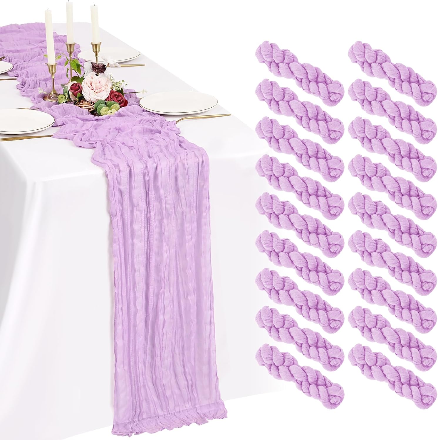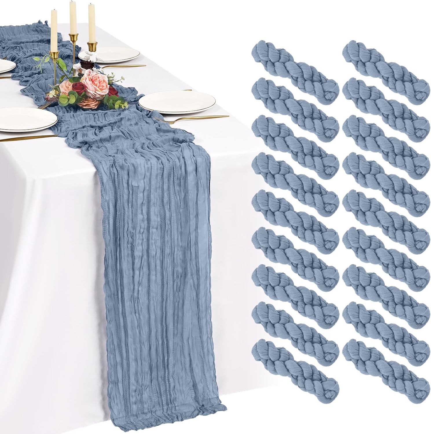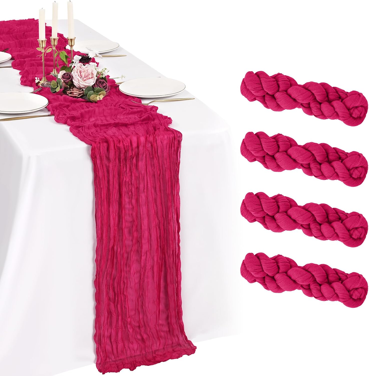 Every Piece Matters to ShowgeousEach set includes 18 pack cheese cloth table runners, measuring 21 x 120 inches (in flat condition), providing ample coverage for your dining table.This ideal size works perfectly for most rectangular and round tables, and can also be used to decorate fireplaces, chairs, curtains as well as wedding arches.FeaturesSoft and ReusableVintage and RomanticSheer and ElegantHandmade and QualityWell-stitched edgesPremium MaterialBeige cheesecloth gauze table runners are made of premium sheer cheese cloth gauze fabric, soft and smooth, hand-dyed from natural material. Washable – colors won't fade with repeated washing. Durable – edges are well-stitched to prevent fraying with repeated use.The rustic boho style with delicate edges and stitches will make your events more romantic and elegant.Exquisite Wrinkled TexturePleating craft, bringing a country farmhouse style to your holiday table decorations, esthetic and lazy, heighten the elegance of the winter tables.Cheesecloth Table Runner for Table DecorWhether you’re hosting a brunch, a garden-inspired dinner, or simply sprucing up your everyday dining area, a thoughtfully designed tablescape can transform any gathering into a memorable experience.Cheesecloth Gauze Boho Table RunnerOur cheese cloth boho table runner is suitable for a variety of occasions, including home decorations, weddings, bridal showers, birthday parties, holiday decorations, baby showers, banquet backgrounds, picnics and important holidays such as Valentine's Day, Thanksgiving, Halloween and Christmas.Showgeous Cheesecloth Table Runner for DecorationsThis rectangular natural pleats gauze table runner has a rustic elegant look, it can be placed on the table or hung on the floor perfectly and elegantly and adds a sophisticated, soft, beautiful touch to your table at any event.