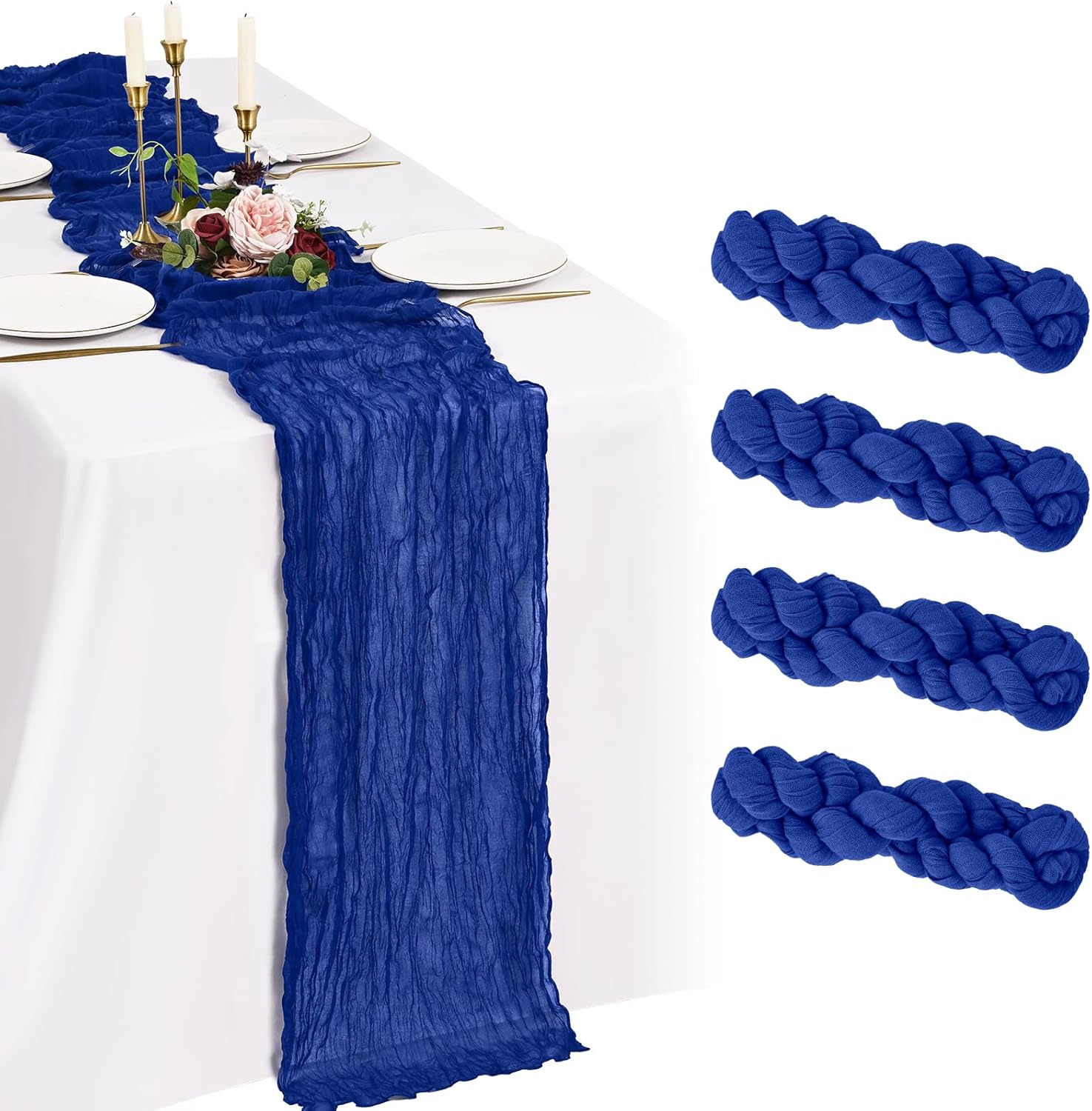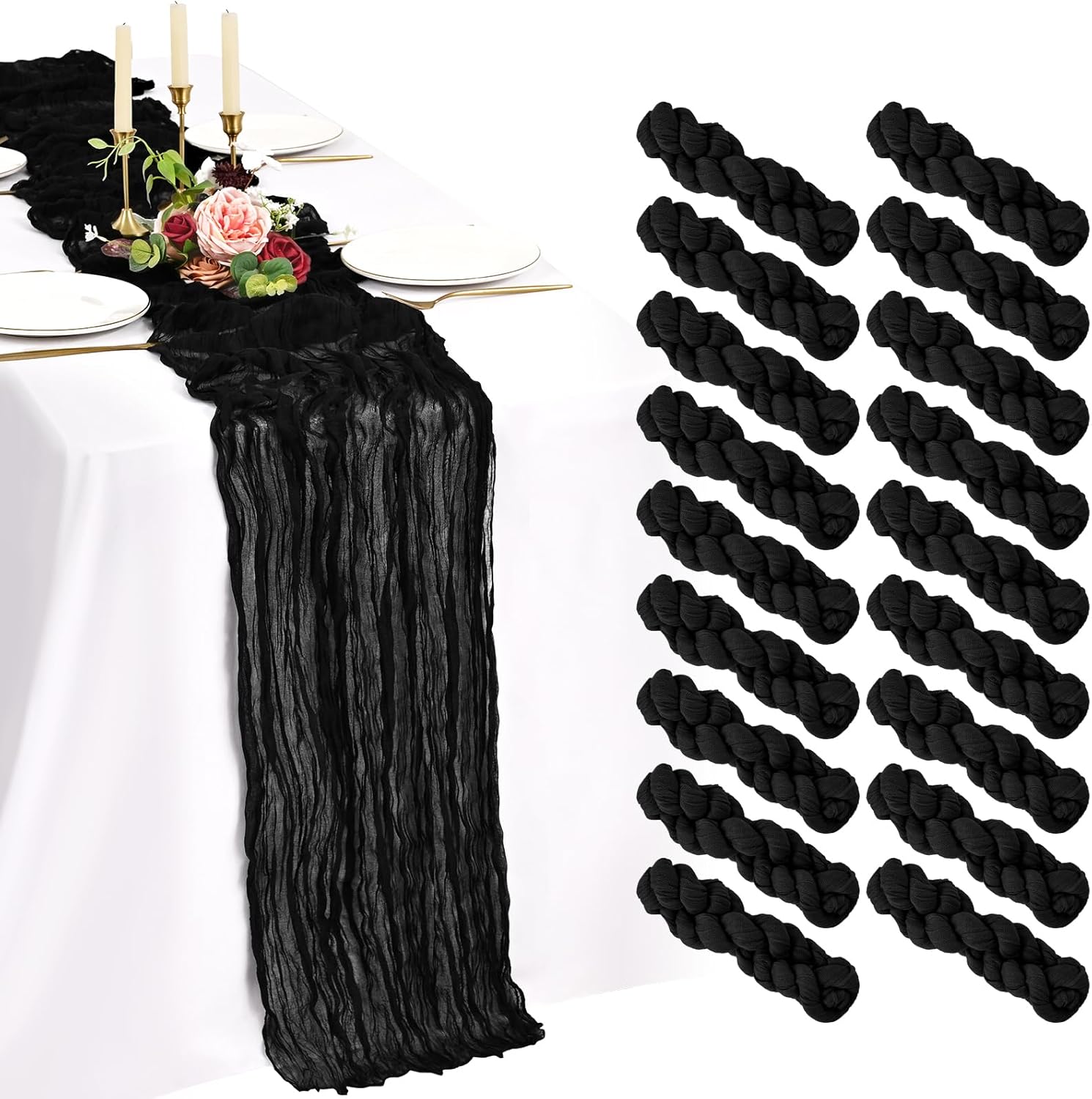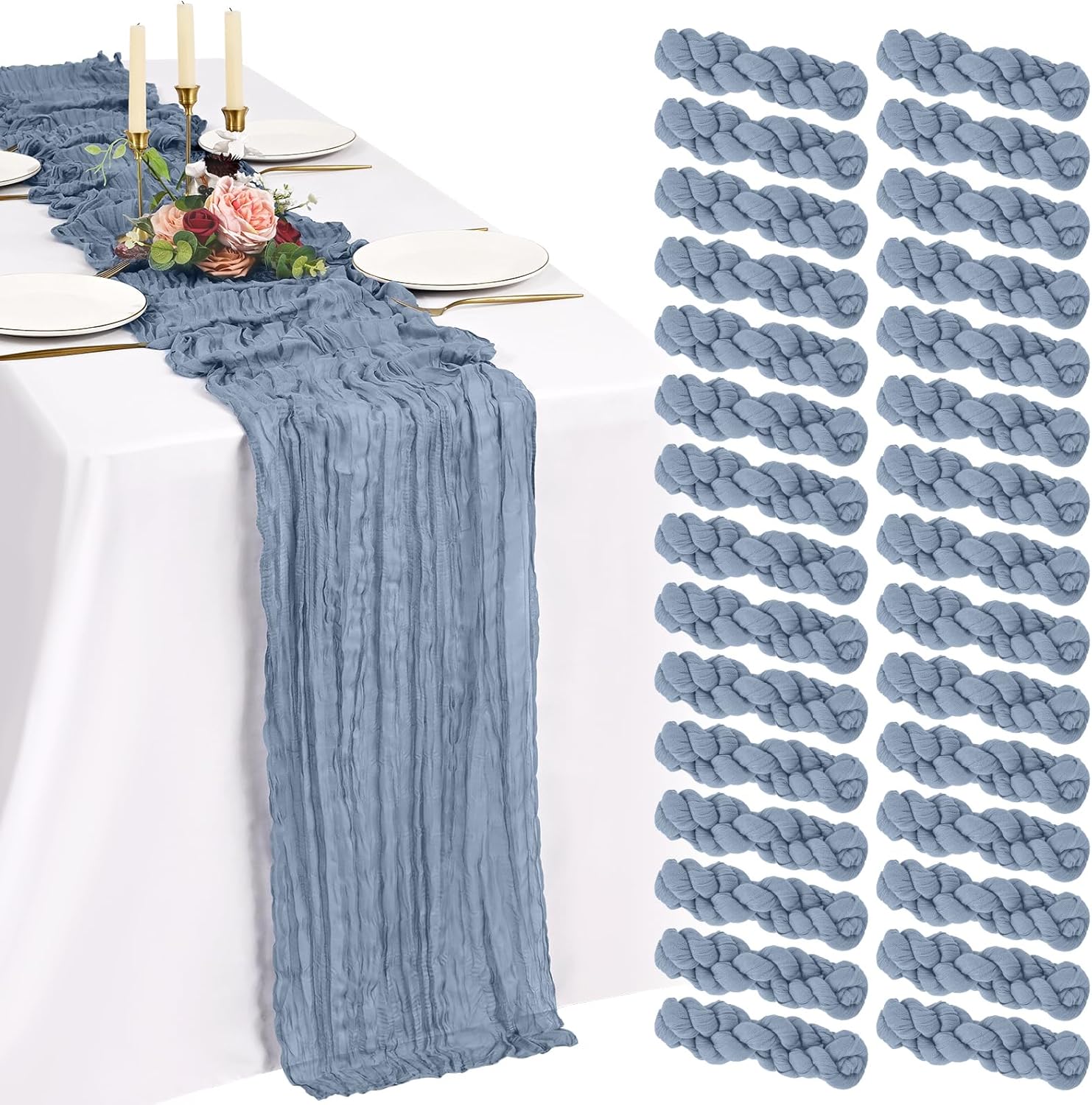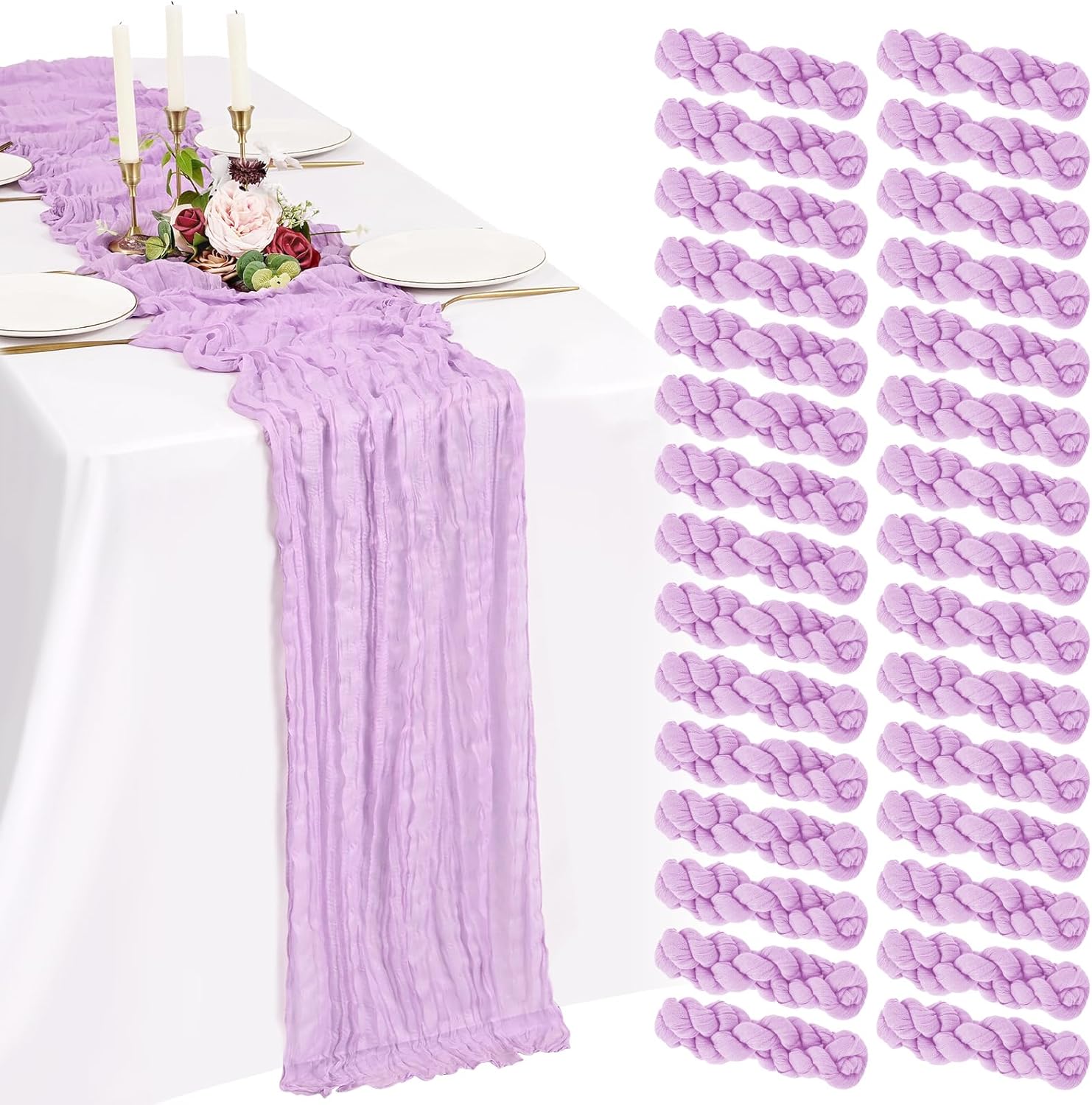 Every Piece Matters to ShowgeousEach set includes 18 pack cheese cloth table runners, measuring 21 x 120 inches (in flat condition), providing ample coverage for your dining table.This ideal size works perfectly for most rectangular and round tables, and can also be used to decorate fireplaces, chairs, curtains as well as wedding arches.FeaturesSoft and ReusableVintage and RomanticSheer and ElegantHandmade and QualityWell-stitched edgesPremium MaterialBeige cheesecloth gauze table runners are made of premium sheer cheese cloth gauze fabric, soft and smooth, hand-dyed from natural material. Washable – colors won't fade with repeated washing. Durable – edges are well-stitched to prevent fraying with repeated use.The rustic boho style with delicate edges and stitches will make your events more romantic and elegant.Exquisite Wrinkled TexturePleating craft, bringing a country farmhouse style to your holiday table decorations, esthetic and lazy, heighten the elegance of the winter tables.Cheesecloth Table Runner for Table DecorWhether you’re hosting a brunch, a garden-inspired dinner, or simply sprucing up your everyday dining area, a thoughtfully designed tablescape can transform any gathering into a memorable experience.Cheesecloth Gauze Boho Table RunnerOur cheese cloth boho table runner is suitable for a variety of occasions, including home decorations, weddings, bridal showers, birthday parties, holiday decorations, baby showers, banquet backgrounds, picnics and important holidays such as Valentine's Day, Thanksgiving, Halloween and Christmas.Showgeous Cheesecloth Table Runner for DecorationsThis rectangular natural pleats gauze table runner has a rustic elegant look, it can be placed on the table or hung on the floor perfectly and elegantly and adds a sophisticated, soft, beautiful touch to your table at any event.