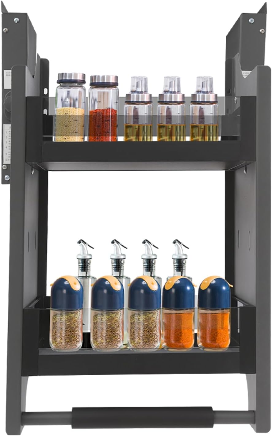 DescriptionDo you feel that the upper cabinet is not being fully utilized? Our 2-tier pull-down shelf will change the traditional way of storing items. It uses a 2-tier pull-down design, combined with an internal assist device, allowing you to easily pull down and push up to complete the retrieval and placement. Choose us to make kitchen storage elegant and efficient from now on.DetailsComfortable Handle: It provides you with a comfortable grip to pull down this shelf easily without hand slipping.Heightened Guardrail: It can prevent your items from falling off.ApplicationThis product can be used in kitchens, bars, cafes, cabinets, storage rooms, etc. for storing bowls, plates, spice bottles, and more.Specification Material: Stainless Steel, Iron, SiliconeProcess: Spraying and WeldingColor: Dark GreyShape: RectangularStyle: ModernAssembly Requirement: NoApplicable Cabinet Interior Width: 56.2-57cm/22.13-22.44inApplicable Cabinet Interior Height: ≥ 56.5cm/22.24inApplicable Cabinet Interior Depth: ≥ 28cm/11.02inProduct Size: 56.2*28*56cm/22.13*11.02*22.05inPackage Size: 67*57*28cm/26.38*22.44*11.02inMax. Load-bearing Capacity: 10kg/22.05lbsGross Weight: 17kg/37.48lbsNet Weight: 15kg/33.07lbsPackage Included1* Cabinet Pull-Down ShelfNotes 1.Please make sure that your cabinet size is suitable before purchasing.2.Please note that this product does not include bowls, plates, spice bottles, etc.3.Please read the product label carefully and use this product within the load-bearing range.4.Please do not operate the knob when pulling out the shelf. The knob can only be locked or unlocked when the shelf is reset in the cabinet.5.Please allow the slight color difference caused by the shooting light and 1-3cm error due to manual measurement, and make sure you do not mind before ordering.