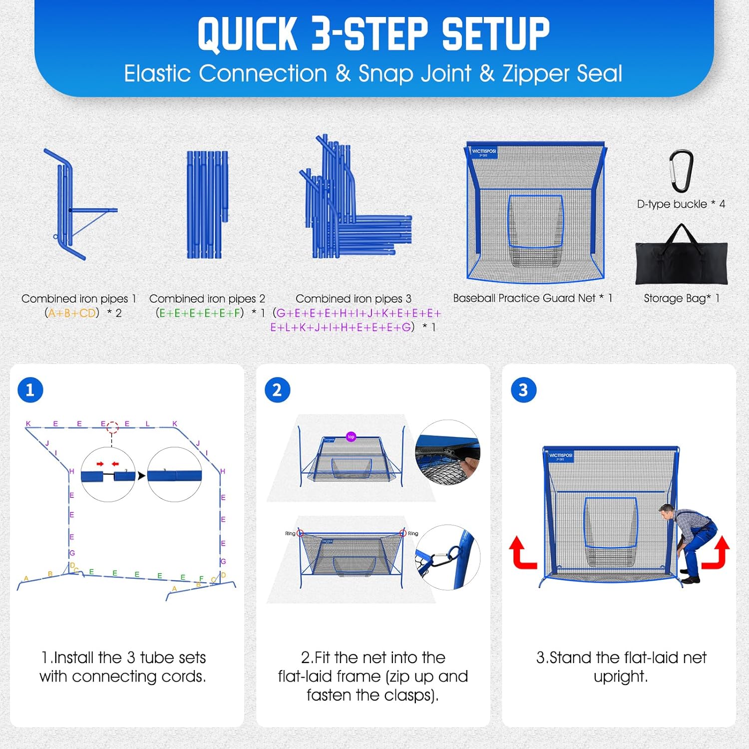 • Heavy-Duty Tough Net​: 7-layer nylon netting withstands up to 130 mph ball speed and 30,000+ hits without tearing.Edge-wrapped zipper design fits tightly with the metal frame,boosting overall durability and keeping the net in place