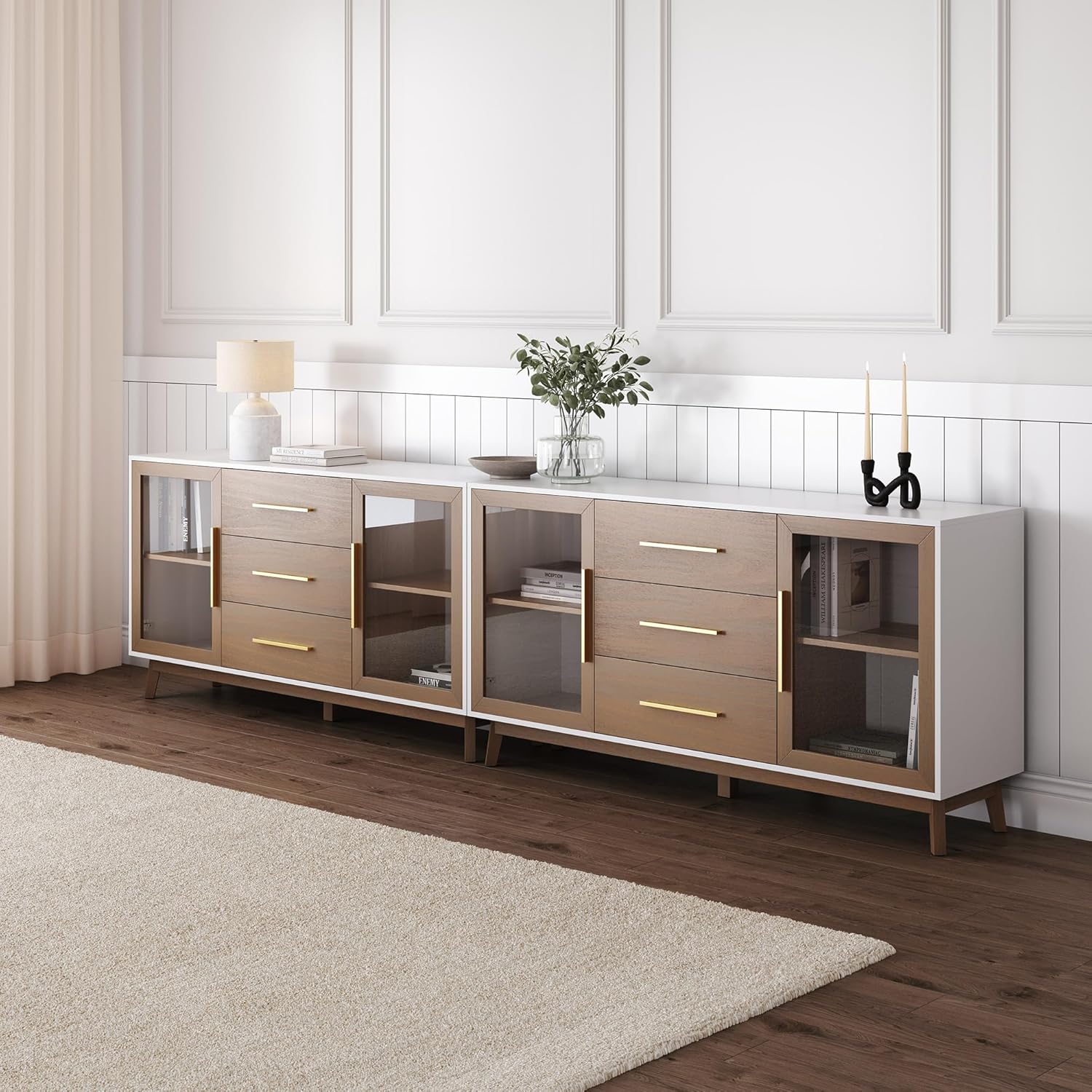 A beautifully designed sideboard with clean lines and a trendy white and brown color scheme to enhance your decor. Our Troy cabinet console will establish a fashion-forward and mod aesthetic in your space with its white accents, rustic wood finish, and glamorous gold-toned metal hardware. In your dining room, kitchen, entryway, or living room, this credenza will instantly uplift any room of your home with its supreme functionality and stunning looks. Upgraded storage in the form of three large drawers and two glass cabinets with adjustable shelves give you plenty of space. Perfect to keep your cookware, serveware, and cutlery, this storage cabinet is a lovely addition to your dining space or kitchen. The spacious tabletop gives a great platform to display your favorite artwork, family photos, or trending decor pieces in the entryway or living room. This accent cabinet works well in your home office or study. A multipurpose accessory that's right for any room in your home. Built for long-lasting durability, this sideboard is made with high-quality manufactured wood and has a weight capacity of 70 lbs. Tempered glass offers better strength and reinforcement, resisting cracking or shattering. Anti-tipping straps enhance the stability of this cabinet.