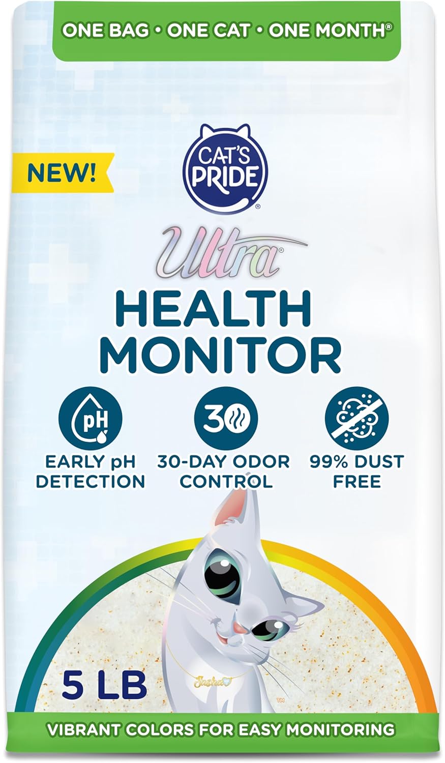 The Cat’s Pride Ultra Health Monitor gives you the tools to actively monitor your cat’s wellbeing from the comfort of your home, all within a high-performance unscented micro-crystal litter. This innovative litter uses advanced pH indicator technology to change colors when early signs of potential urinary health issues appear. Our easy-to-understand color key gives you instant results: deep yellow-to-orange signals low (acidic) pH, olive green-to-yellow represents standard range, and blue-to-dark-green alerts you to high (alkaline) pH. Red granules provide an immediate visual cue of potential blood, prompting you to contact your veterinarian immediately. Beyond its critical monitoring function, Cat’s Pride Ultra offers powerful 30-day odor control, is 99% dust-free, and is 60% lighter than traditional clay alternatives. Get a full month of proactive feline health monitoring and clean-home performance in every 5 LB bag.