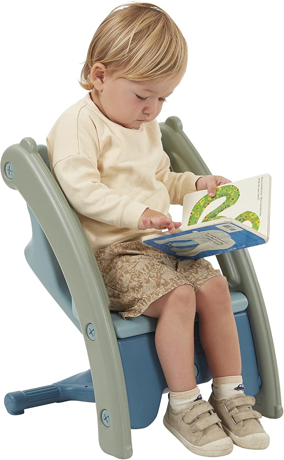 The Sit-N-Rock is double the fun as a classic children’s rocking chair and toddler seat, all-in-one. The unique design transforms easily from a toddler’s chair into a smooth rocking chair for kids. Easy to grip handles and a spacious footplate give toddlers confidence to explore the rocking movement, developing their balance and muscle coordination. When ready to rest, simply flip the chair over to reveal a comfortable seat that’s perfect for reading a story or pair with a table. The lightweight plastic rocker chair for kids is suitable for use indoors and outdoors, with no metal hardware to rust. Made of durable plastic that is easy to clean with a mild soap-and-water solution or your favorite bleach-free cleaning wipe. The indoor-outdoor chair is designed for everyday use in daycares and preschools, and perfect for the home. When used as a chair, the seat height is 9" H. Always have adult supervision when children are riding on the rocker; adult assembly required.