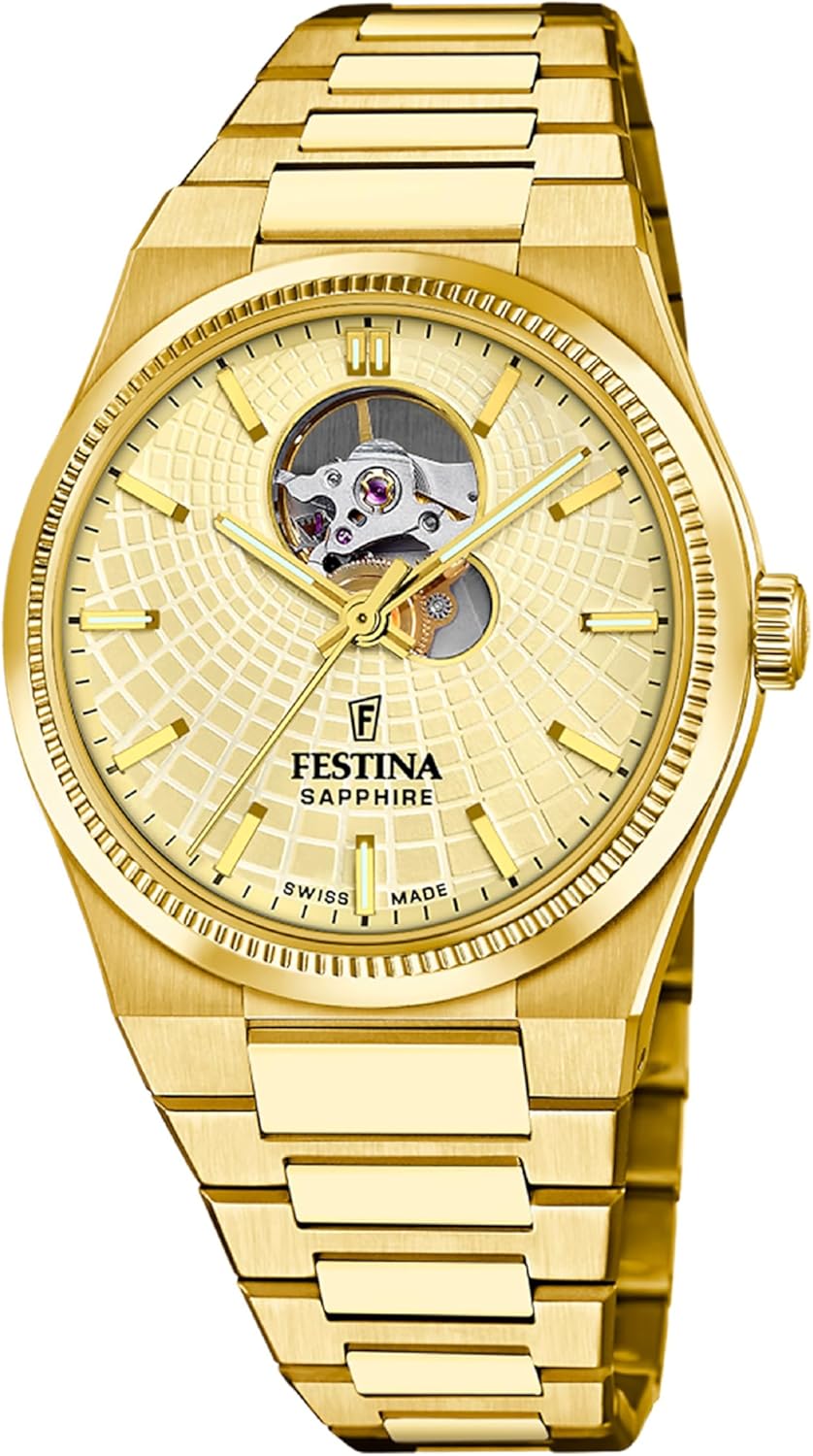 The Festina Swiss, Rivé Open Heart 40mm luxury watch is a true symbol of elegance, quality, and durability. Featuring a large Silver paired with a Silver band, this watch is designed for those who appreciate high-end craftsmanship. Its sapphire crystal face offers unparalleled scratch resistance, ensuring that your timepiece maintains its polished, pristine look over time. The Automatic movement guarantees accurate and reliable timekeeping, making this watch both a stylish accessory and a functional timepiece. With water resistance up to 330 feet, this men's wristwatch is perfect for the adventurous individual who enjoys water sports like swimming, snorkeling, and diving. You can confidently wear this luxury watch without worrying about water damage, making it ideal for both urban settings and aquatic environments. Whether you're looking for a reliable everyday watch or a luxury piece to add to your collection, this watch offers everything you need in terms of style, durability, and performance. Our watch has an elegant and timeless design that makes it a statement timepiece. It serves as an excellent Silver watch that has a striking contrast of a Silver dial and Silver Stainless Steel band. The combination of materials and craftsmanship makes this a standout piece among luxury watches for men, delivering both beauty and functionality. The Silver dial adds a sleek contrast to the Silver band, creating a stylish and sophisticated look that is perfect for a range of occasions. Whether you're dressing up for a formal event or looking for an everyday accessory, our watch delivers on all fronts. It's a standout piece in the world of watches for men, blending luxury, style, and practicality.