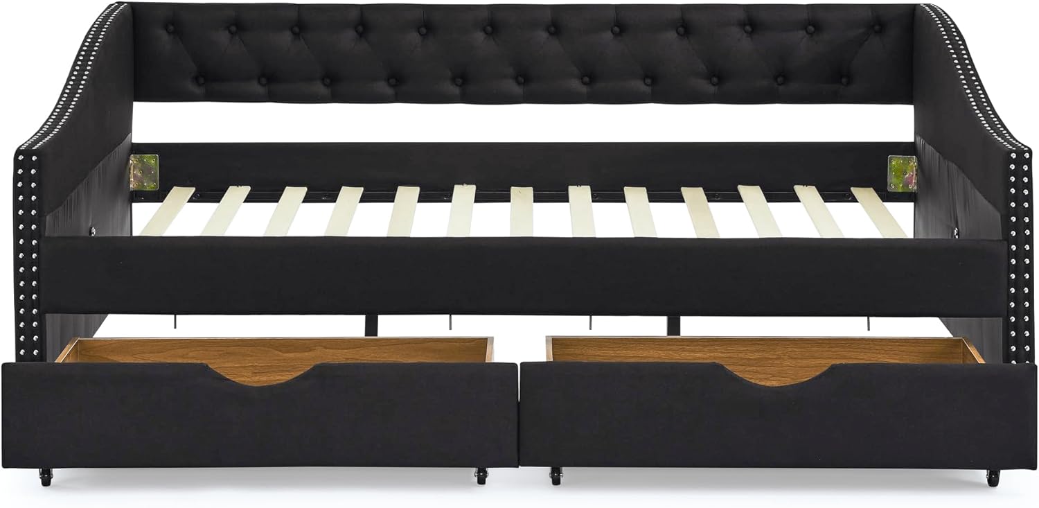 Product Dimensions: 80.5W x 55.5D x 27.5H in Color: Black Material: Linen (Upholstery), Eucalyptus Wood (Frame), MDF, Foam (Padding) Weight Capacity: 500 lbs Recommended Mattress Thickness: 8 inches (Mattress not included) Drawer Size: 33.6 x 20 x 5.5 inches Assembly Required: Yes (Power drill needed)This Full Size Upholstery Daybed with Drawers combines modern design with functional features. Its elegant button-tufted backrest and waved shape arms with copper nail detailing provide a sophisticated touch to your home. The black linen upholstery ensures it will fit seamlessly into a variety of interior styles, whether in the living room, guest room, or bedroom.Two pull-out drawers beneath the daybed offer plenty of storage for pillows, blankets, or toys, helping you keep your living space neat and organized. These drawers are easy to access and provide an additional, convenient storage solution without taking up extra space.The sturdy frame, made from eucalyptus wood and MDF, supports up to 500 lbs, ensuring long-lasting durability and stability. Foam-padded backrest and sides offer optimal support for both sitting and sleeping, providing a comfortable experience whether you're lounging or hosting overnight guests.This daybed is ideal for multi-functional rooms, offering both comfortable seating and a full-size sleeping area for guests. With its sleek black color and versatile design, this daybed enhances any space, making it perfect for apartments, kids' rooms, or guest rooms.