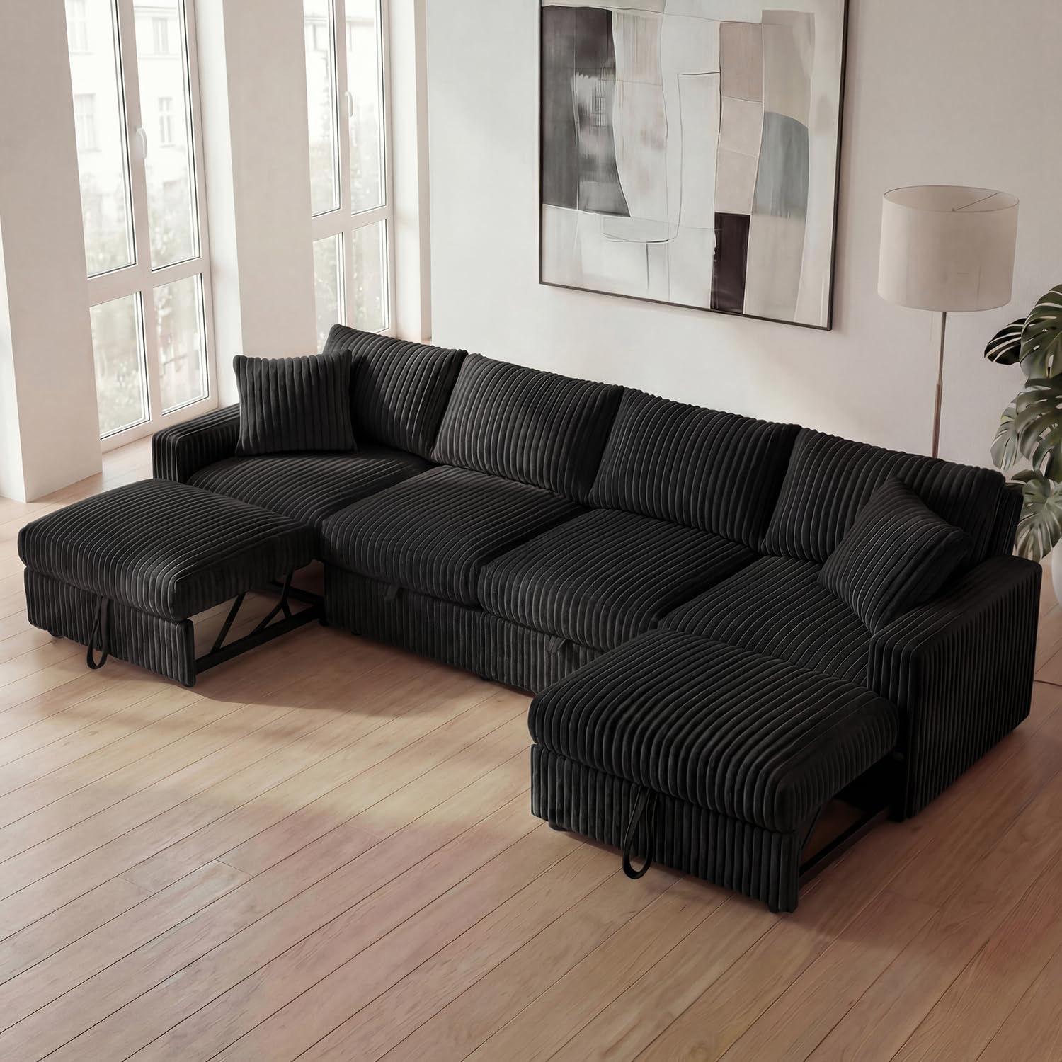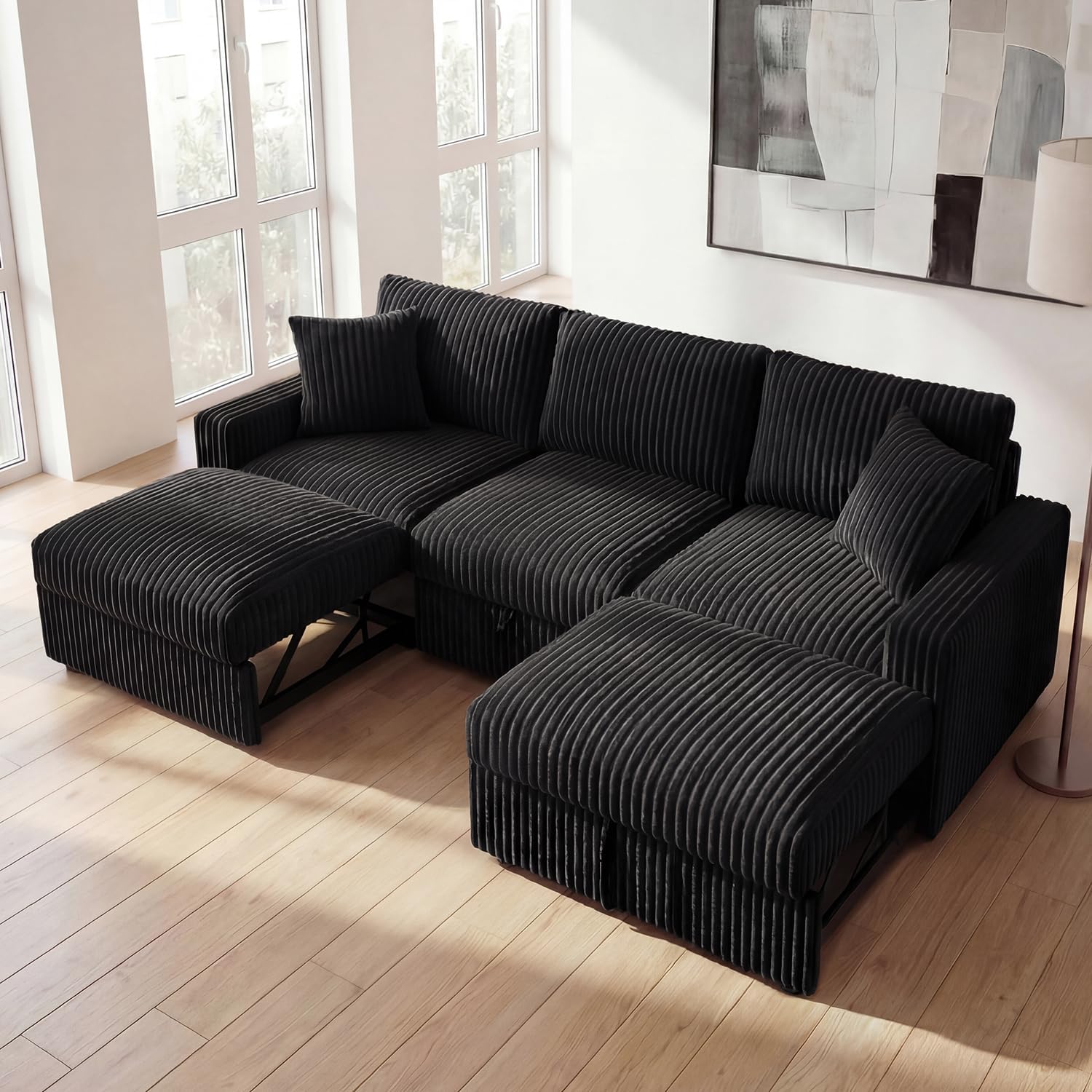 Convertible Design: Extend pull-out left/right seats and ottoman to switch 3-seater sofa into 4-seater/5-seater U-shape, L-shape, or sleeper bed effortlessly, ideal for gatherings or overnight guests Hidden Storage Space: Spacious compartments in middle seat and ottoman keep blankets and pillows organized Tool-Free Assembly: No tools required! Simplified instructions and modules let you set up without expertise, start relaxing faster Luxury Velvet Upholstery: Thick, plush velvet fabric offers skin-friendly softness and subtle texture, elevating room aesthetics . Couch size: The overall size of the couch is 94.5’’×59.1’’×34.6’’.Sturdy construction supports up to 300 lbs per seat, ensuring long-lasting durability for daily use by adults Removable Washable Covers: Detachable fabric covers are machine-washable, effortlessly refreshing the sofa Please NOTE: The sectional couch will come in 4 boxes, they may not delivered at the same time. Please tell us if it happens, we will help you with this