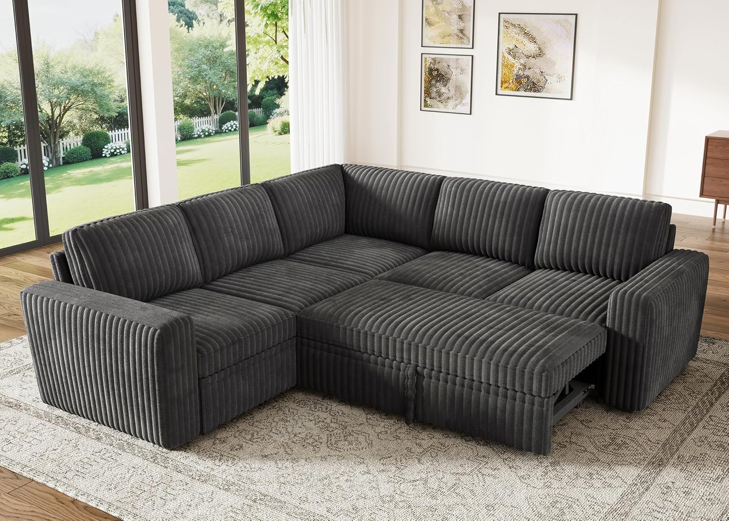 HONBAY Modular Sectional Sleeper Sofa with Pull Out Bed,Corduroy L Shaped Couch with Storage, Sectional Couches for Living Room,Black