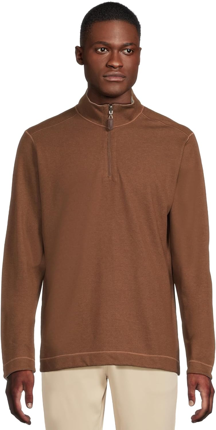 Soft cotton-blend heather knit reverses to a different color for multiple wear options, Quarter zip placket with logo leather-look pull, Tonal cover-stitch details, Logo embroidery on back neck, 52% Cotton/ 24% Polyester/ 24% Rayon