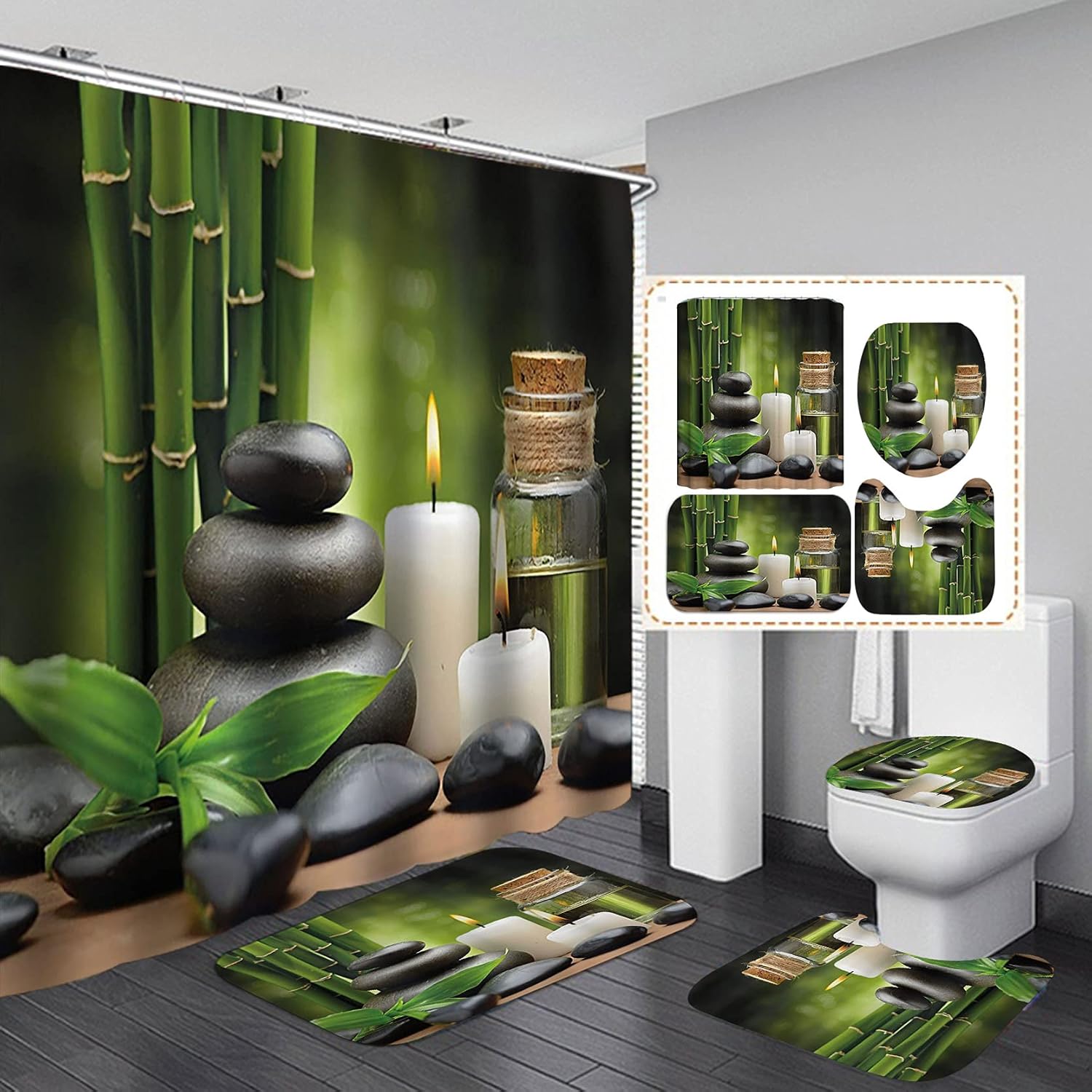 đWhat will you get? đ1PC Shower Curtainđ3PCS Toilet Matsđ12PCS HooksđWhy Choose "OLEBETY" ?1. We have our own factory with more than 15 years of professional experience. We can better reduce costs and strictly control quality.2. The "OLEBETY" shower curtains are made of upgraded and premium polyster material, which is waterproof, hygienic and durable. Our rugs are made of skin-friendly and soft flannel.đFEATURESâHygienic & Eco-friendlyâNo Chemical Odour; Safe Materialâ Waterproof Shower CurtainâNon-slip Matsâ Durableâ Machine Washableâ Super Easy to Clean; Dry QuicklyđSPECIFICATIONSSize: Shower Curtain 180*180 cm / 72*72 inchRectangle Mat: 45*75 cm / 18*30 inchU Shape Mat: 37*45 cm / 14.5*18 inchToilet Lid Cover Mat: 35*37 cm / 13.8*14.5 inchMaterial: Premium PolyesterTheme: Bamboo; Lotus; Candle; Running Waterđ ATTENTION1. It's OK for machine wash, hand wash or wiped by damp cloth.2. Wash the shower curtain in water below 30â°C, Ironing within 100â°C.3. Do not tumble dry, dry clean, or bleach.4. Please allow a deviation of 1-2cm due to manual measurement.5. Due to the different picture resolution and display settings of the computer, the colors may be slightly different.