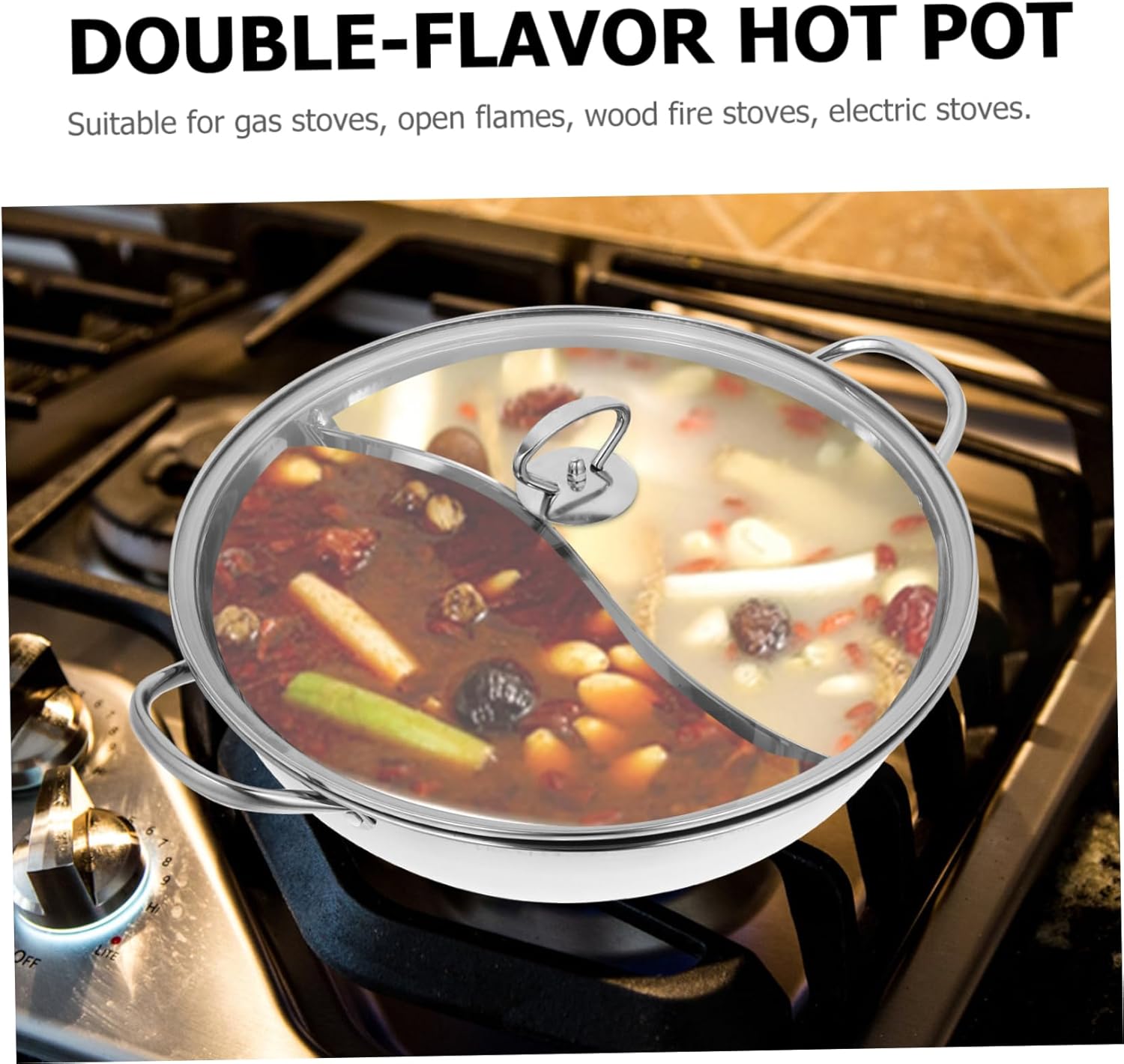 Package Include 1 x pot 1 x lid Features -Color:Silver cooking pots with -Size:34.00X34.00X8.50cm/13.36X13.36X3 protection. -Material:Stainless steel noodle soup - The hotpot pot is made of thick and sturdy stainless steel, can withstand frequent use non-stick frying. - The polished surface makes it easy to be cleaned and maintained, ensuring a safe cooking experience dry. - This stainless steel hot pot is suitable for family gatherings or parties, with its large capacity and dual compartments n. - The included divider allows you to cook two different types of hot pot in one pot, catering to different tastes and preferences Two-flavor Hot Pot. - With excellent heat conductivity, it heats up evenly and quickly, making it suitable for cooking a variety of hot pot dishes cooking pots.Goods Informationdual sided hot pot Our stainless steel hot pot is suitable for family gatherings or parties. With its partitioned design, you can enjoy two different flavors in one pot.hot pot with divider This hot pot is compatible with various types of stoves, making it a practical choice for any home.Gas cooking pot This hot pot is sturdy and
