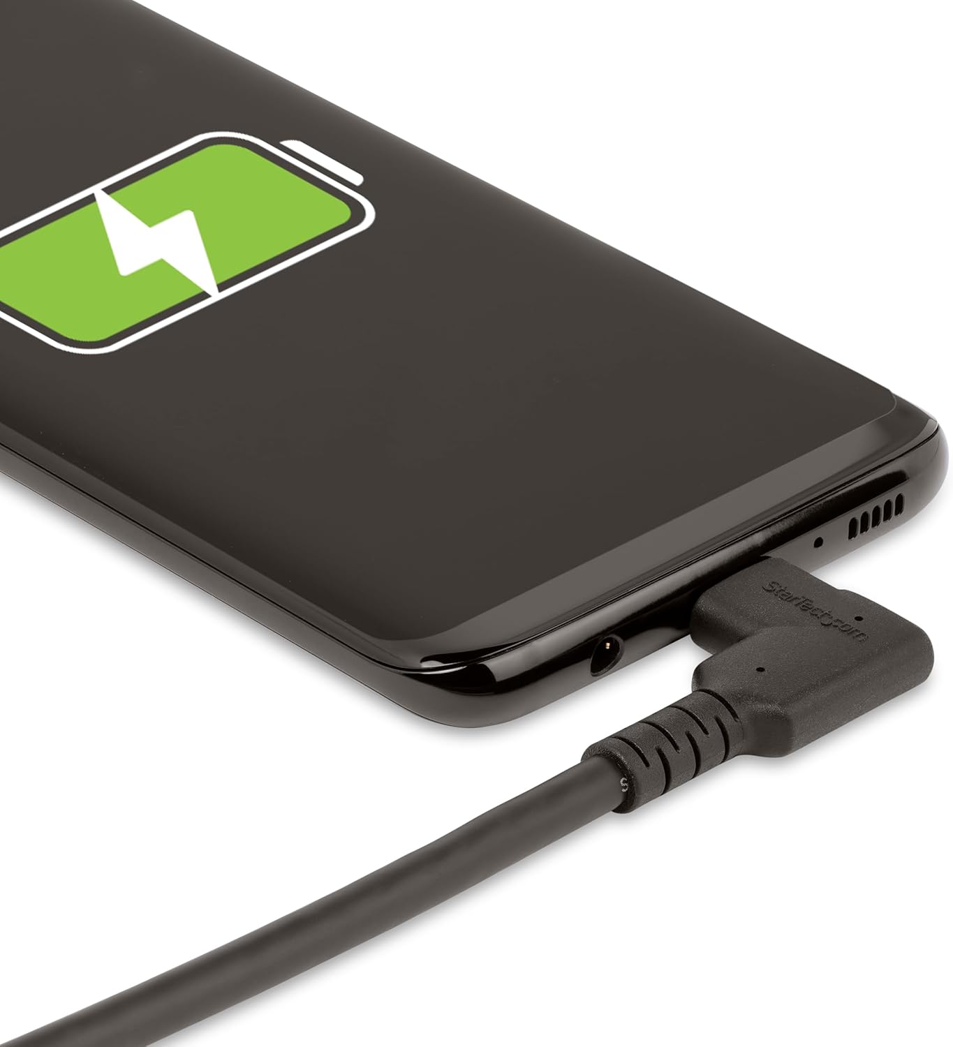 Connect USB 3.2 Gen 2 (10 Gbps) source and peripheral devices, using this 3.3ft (1m) Rugged Right Angle USB Type-C Cable. Reduce cable clutter and avoid prolonged strain from bending. It is ideal for external USB-C-enabled devices or as a single-cable connection from a USB-C dock to a laptop. The Rugged USB-C Cable supports up to 4K 60Hz video over DisplayPort 1.2 Alt Mode with DSC, HDR, and HBR3, and is compatible with 1080p and lower resolutions. Durable USB C to C cable reinforced with Aramid fiber and TPE outer jacket protects against fraying or breakage. This USB Type-C cable reliably delivers up to 10Gbps transfer rates and up to 100W PD output. Power and charge a USB-C laptop, such as Apple MacBook, Lenovo ThinkPad, or Microsoft Surface with up to 100W output over USB Power Delivery 3.0. Connect the USB-C cable from a laptop to a USB-C wall charger or docking station. The USB-C Cable is backed for 2 years including free lifetime multi-lingual technical assistance.