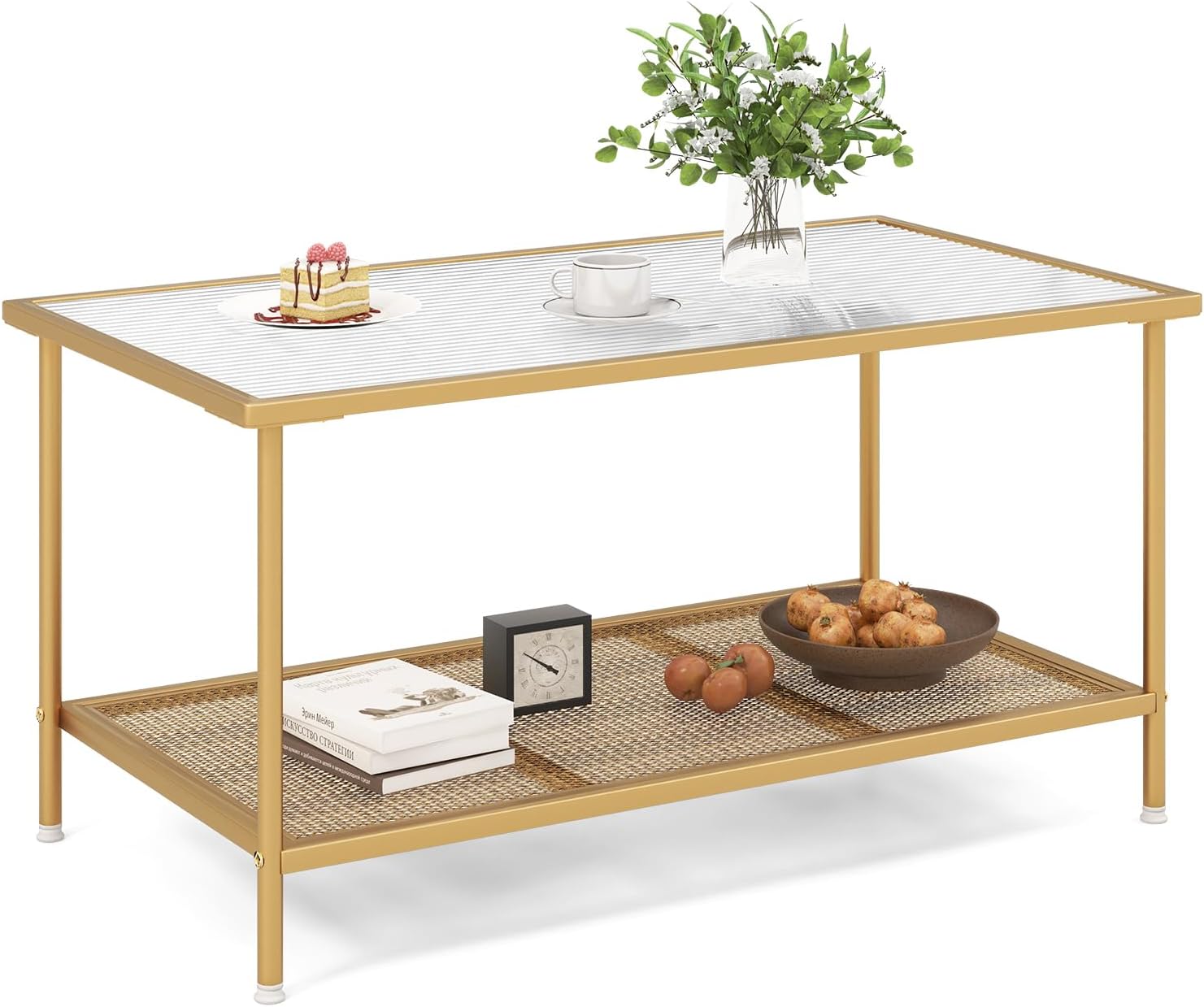 DescriptionTransform your lounge into a haven of chic elegance with this 2-tier rectangular coffee table. Bask in the glow of a scratch-resistant, heat-toughened reeded glass surface that promises effortless maintenance. Encased in a resplendent golden frame that infuses a sprinkle of luxury into your home, this coffee table is more than a piece of furniture—it’s a statement. Below the sleek tabletop, a spacious metal mesh shelf awaits, ready to organize your favorite reads and showcase treasured trinkets. With adjustable foot pads, it stands unwavering on hard wood floor or carpet. Whether it’s your coffee haven or a stage for your tech, this table harmonizes with every setting, bringing with it a flourish of functionality and unmatched style. FeaturePremium tempered glass top features high temperature resistanceWith protective suction pads to keep the glass top in place2-tier table offers ample space for living room essentialsAdjustable foot pads prevent the table from wobblingExquisite details make it look chic and stylish Round corners of tabletop are designed for safe useEasy to assemble under the guidance of straightforward instructionSpecificationColor: GoldenMaterial: Metal, Tempered GlassOverall Dimension: 35.5” x 20” x 18.5” (L x W x H) Size of Open Shelf: 32.5” x 18.5”(L x W) Distance Between Tabletop and Shelf: 13” Height off the Ground: 4” Max Load Capacity of Tabletop: 100 lbsMax Load Capacity of Shelf: 110 lbsNet Weight: 16 lbsPackage Includes: 1 x Coffee Table1 x User Guide