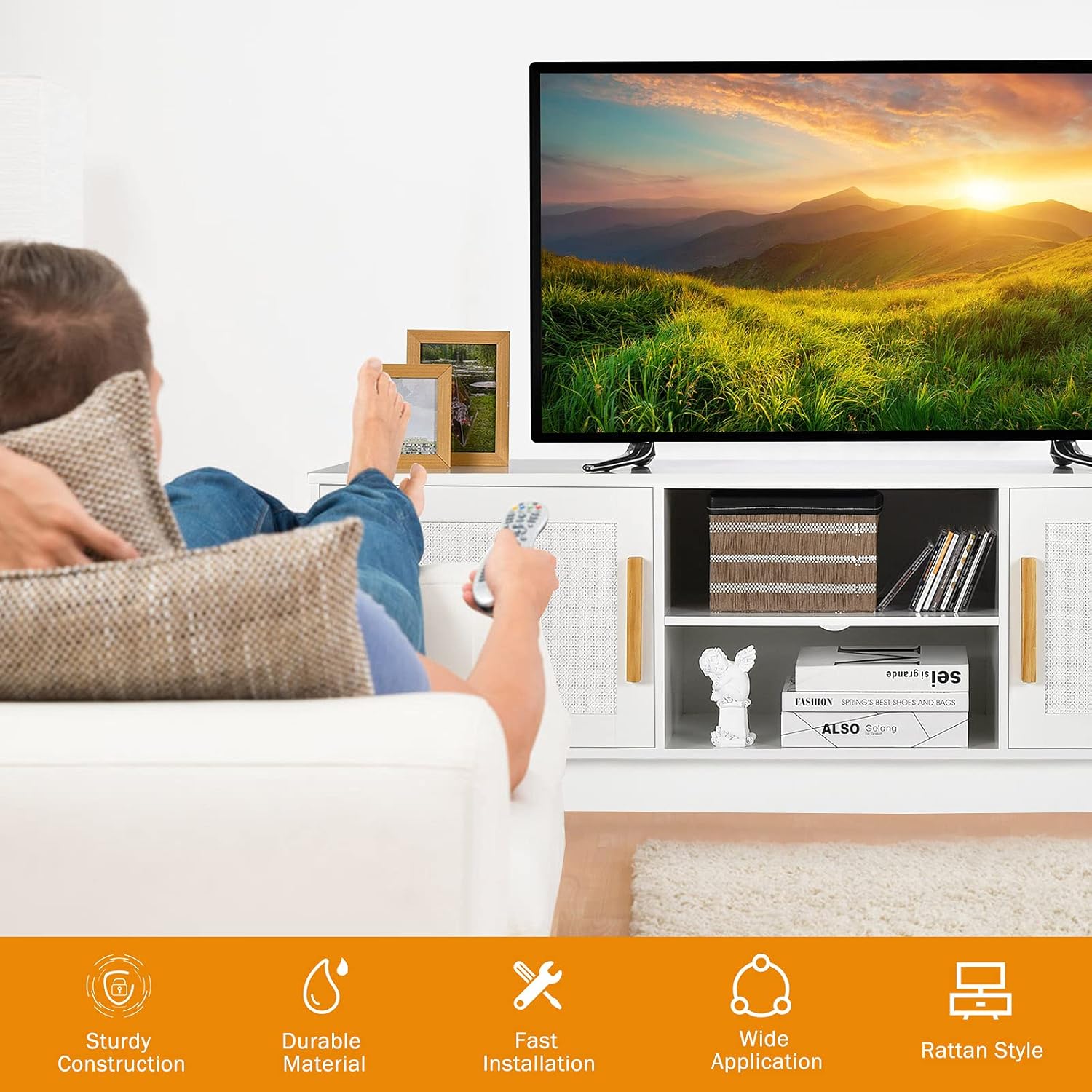 Tangkula Rattan TV Stand for TVs Up to 65", Entertainment Center, 3-Tier Adjustable Shelf, 2 Enclosed Weaved Cabinets, Cable Holes, Modern Media TV Console Table for Living Room